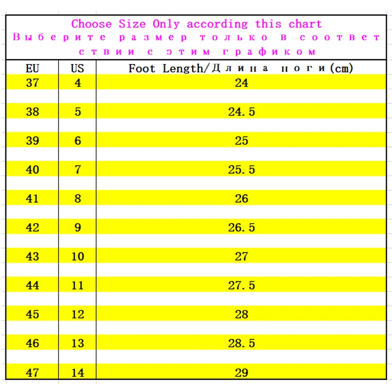 Пожалуйста, проверьте таблицу размеров перед тем, как сделать заказ.(Пожалуйста, заказывайте обувь в соответствии с длиной стопы, а размер в обуви-китайский размер, а не европейский размер или другой размер)Если вы не уверены, свяжитесь с нами.