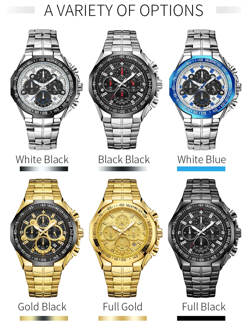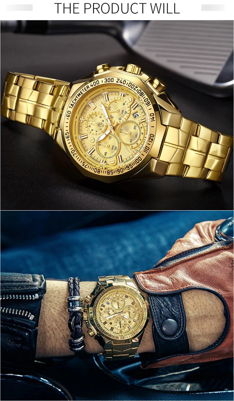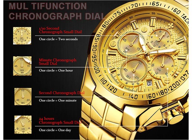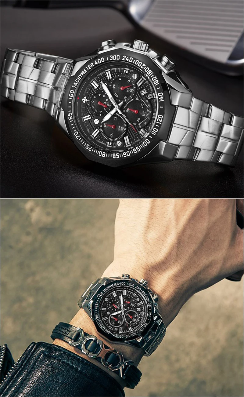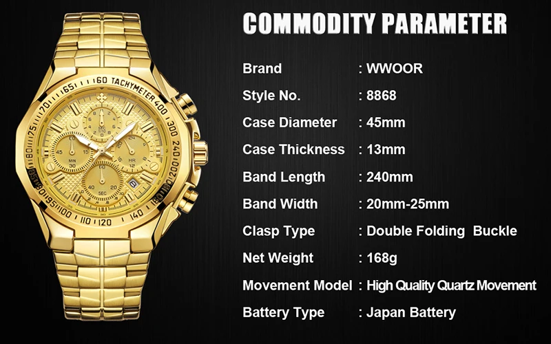 Технические характеристики Материал корпуса: сплав с вакуумным покрытием Чехол Диаметр: 45 мм Чехол Толщина: 14 мм Материал ремешка: нержавеющая сталь Длина ремешка (включая чехол): 240 мм Ширина ремешка: 24 мм Вес нетто: 168 г Механизм: кварцевый механизм высокого качества Водонепроницаемость 30 метров (поддержка купания и холодного душа) Примечание: Все маленькие циферблаты работают Что входит в комплект: 1x100% wwoor мужские часы с хронографом 1 x оригинальная коробка 1 x инструмент для регулировки ремешка часов 1 x Ткань для очистки