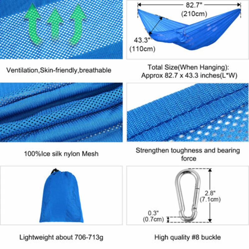 * Содержимое упаковки и функции: двойная кровать-гамак (изготовлен из прочного шелка льда нейлоновой сетки).