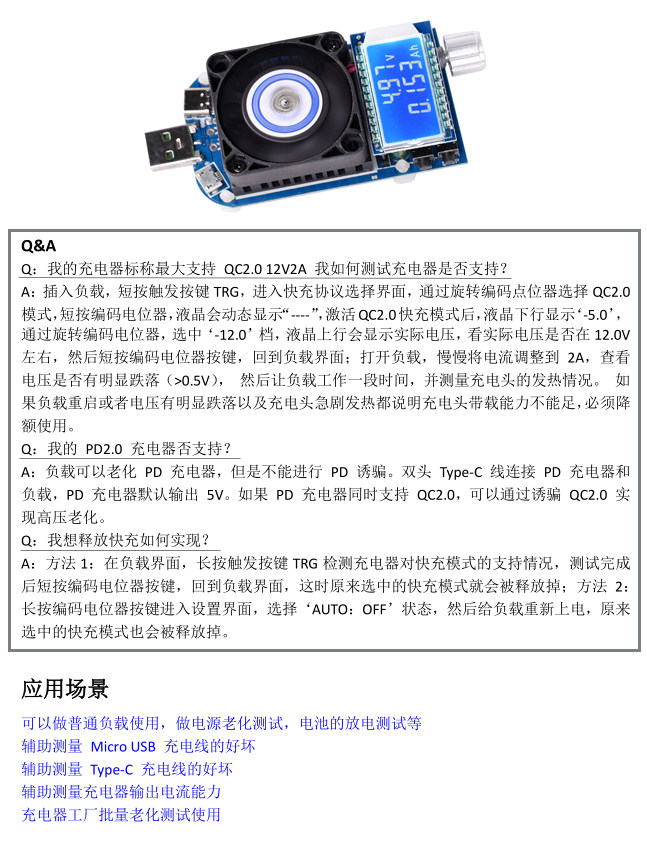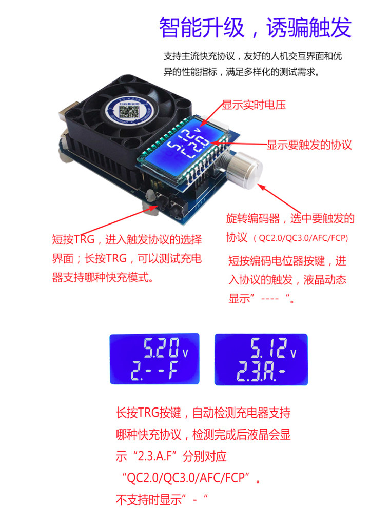 Интеллектуальная электронная нагрузка USB, может использоваться в качестве обычной электронной нагрузки, также может использоваться в качестве электронной нагрузки USB, может обмануть протокол быстрой зарядки QC2.0/QC3.0/AFC/FCP, триггер выход 5 В/9 В/12 В/20 в и т. д. напряжение; ЖК-дисплей, дружественный интерфейс человека-компьютера и отличные показатели производительности для удовлетворения различных потребностей тестирования.