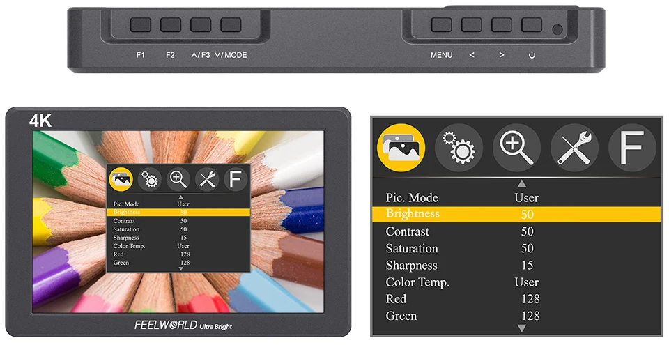 Элементы управления меню интуитивно понятны и просты в использовании. В верхней части монитора вы получите полную раскладку кнопок. Три кнопки различных функций, которые программируются на различные функции, которые вы используете больше всего. Возможно, вы можете установить одну из быстрых клавиш для функции переворачивания изображения, чтобы экран можно было быстро перевернуть при съемке вверх дном.