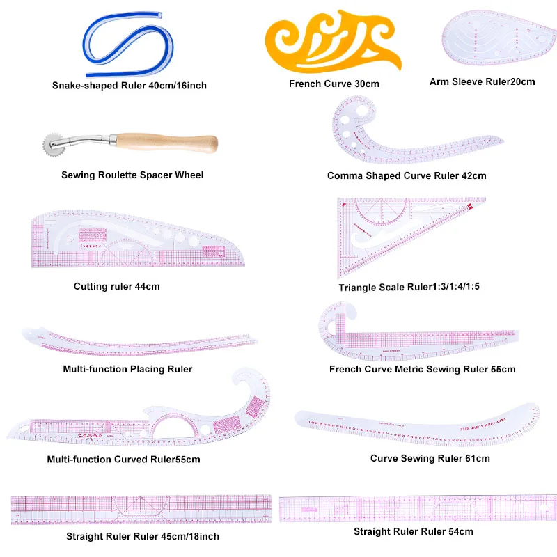 1x3245 режущая линейка 44 см 1 x колесо для шитья рулетки 1 x C.T-40 линейка в форме змеи 40 см/16 дюймов 1 линейка B55 прямая Линейка 54 см 1 x прямая Линейка B95 45 см/18 дюймов 1x6501 французская кривая Метрическая швейная линейка 55 см 1x3250 Многофункциональный изогнутый Ролик 55 см 1x6401 нарукавник 20 см 1x3231 форма запятой кривая линейка 42 см 1x6301 многофункциональная линейка для размещения 1 х 3220 треугольная шкала Руллер 1:3/1:4/1:5 1x12-260 кривая швейная линейка 61 см 1 x французская кривая 30 см