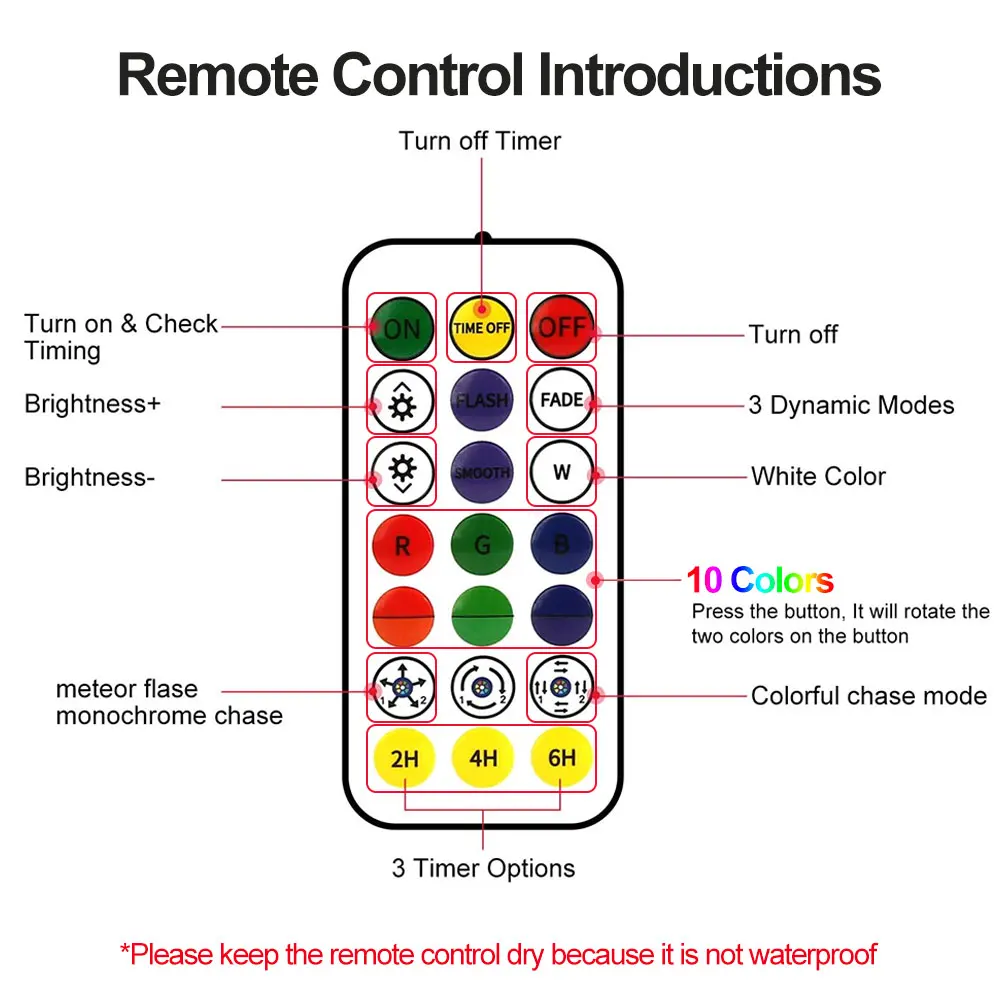 Оптимизировано 10 динамических цветов, несколько режимов (вспышка, выцветание, гладкая), увеличено 3 кнопки таймера (2h, 4h, 6h, ), Функция затемнения, дает вам больше выбора, И создает более красивую атмосферу.