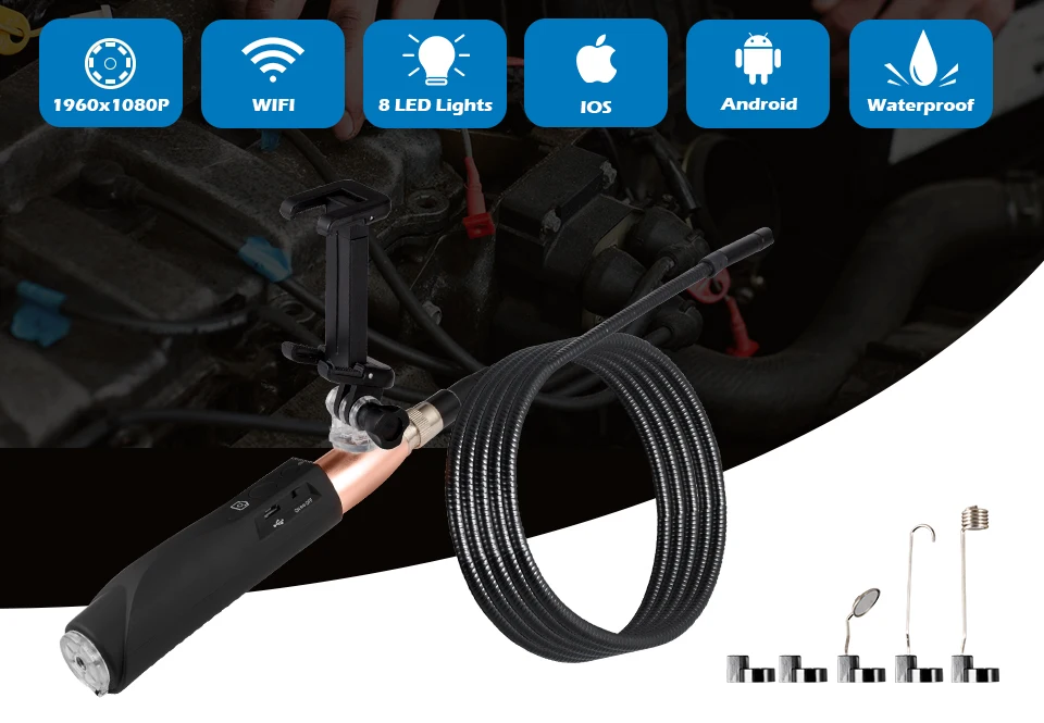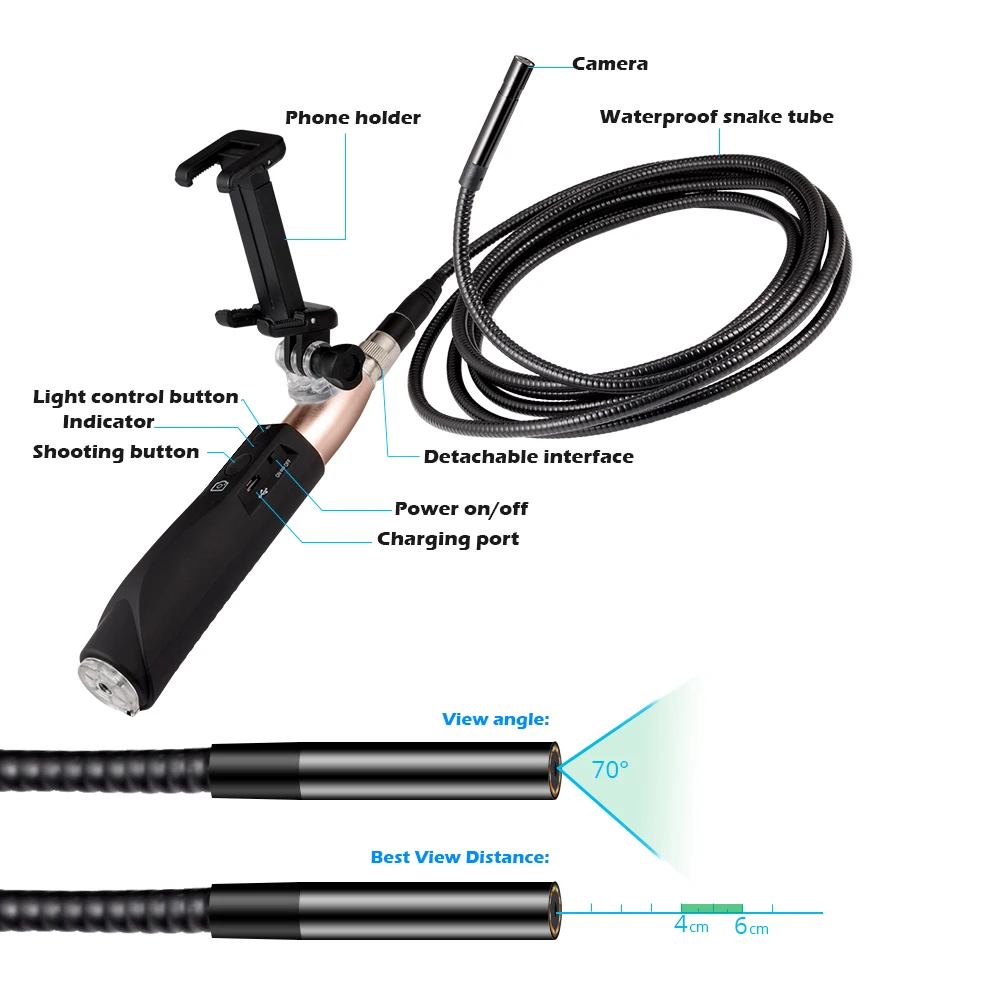 Диаметр объектива: 8 мм Разрешение: 1960x1080 Угол обзора: 70 Источник света камеры: 8 светодиодных ламп Степень водонепроницаемости: IP67 Рабочая температура: 0 ℃-80 ℃ Емкость батареи: 800mA Время работы: 90 минут Змеевидной трубке съемный Система поддержки: ios/android Фокусное расстояние: 4-6 см (лучшее расстояние просмотра) Мощность: 5 В пост Функция: фотографируйте, записывайте видео