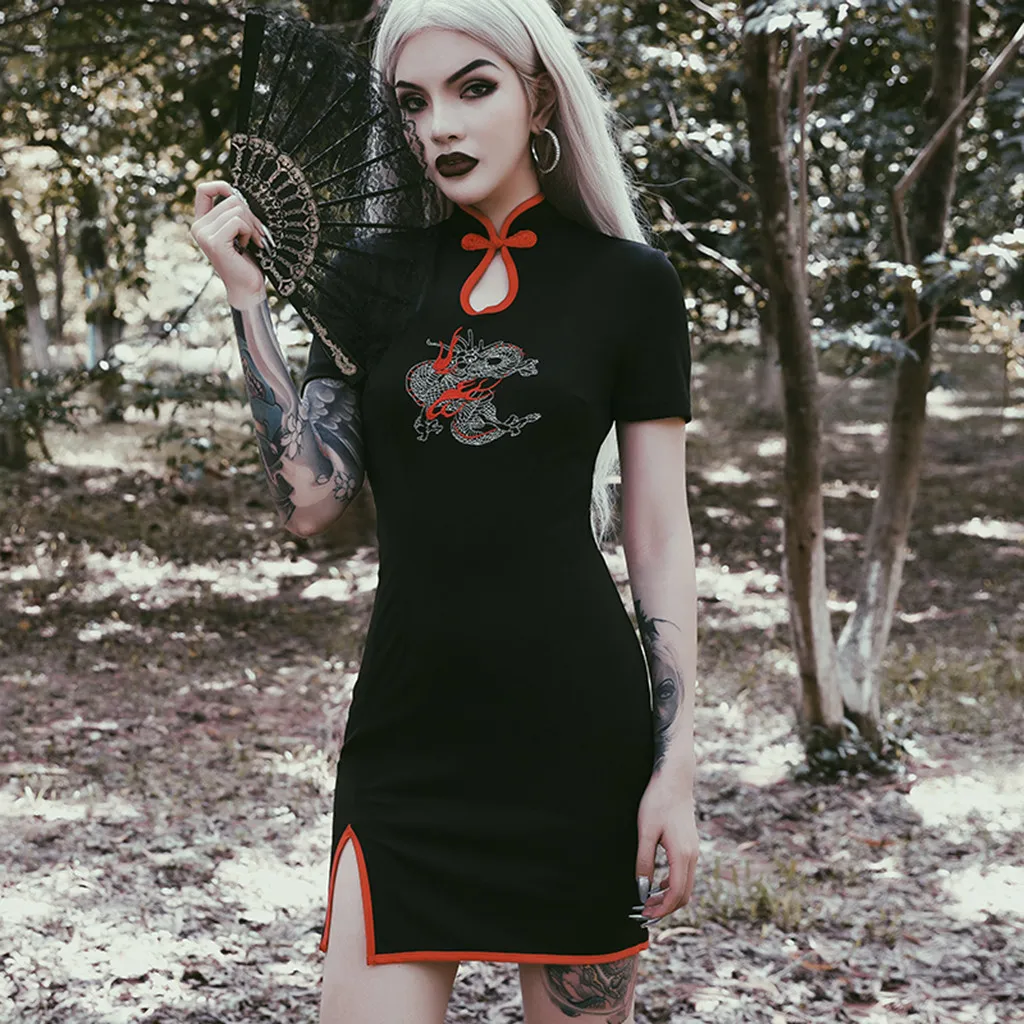 Женское готическое панк китайское платье Cheongsam с вышивкой, винтажное платье с разрезом