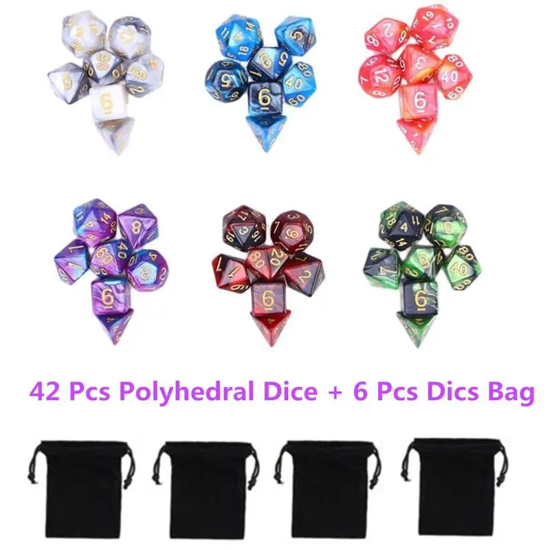 42 шт. (6x7 наборов), двухцветные многогранные кубики, набор акриловых кубиков для игр с цифрами для Dungeons и Dragons, вечерние настольные игры с математикой и 6 черными сумками для хранения (зеленый, синий, розовый, небесно-голубой, красный, черный, черный и золотой)