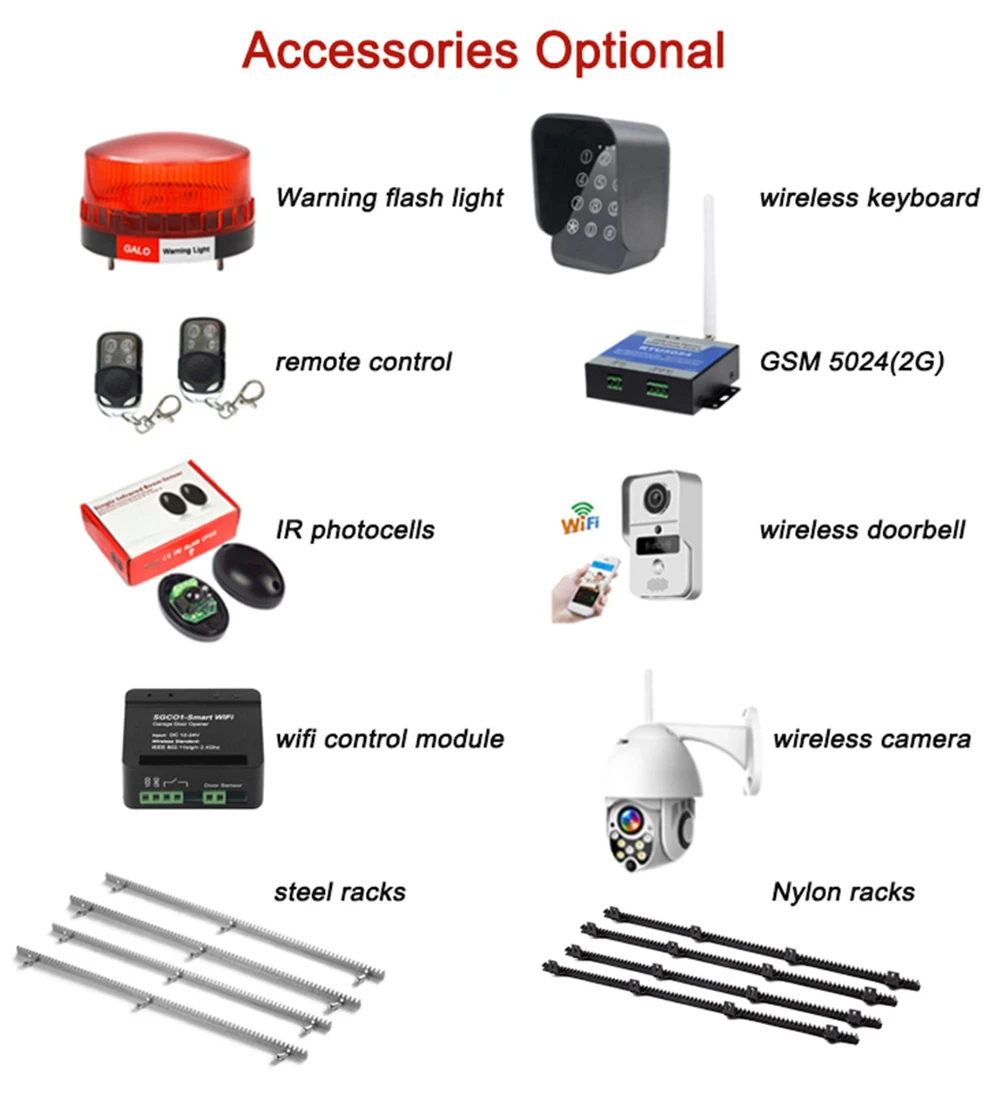 1. Полностью интегрированная электрическая механическая система (количество стеллажей опционально). 2. Интерфейс платы управления для дополнительных ударопрочных инфракрасных фотоэлементов. 3. Можно подключить мигающий светильник, клавиатуру и электрический замок и так далее. 4. Автоматическое Отложенное закрытие. 5. Регулируемая чувствительность сопротивления. 6. Автоматическая остановка ворот и повторное открытие при возникновении препятствий. 7. Беспроводной пульт дистанционного управления или проводной пульт дистанционного управления являются дополнительными. 8. 24 В постоянного тока раздвижные ворота открывалка может подключить трансформатор и резервную батарею.