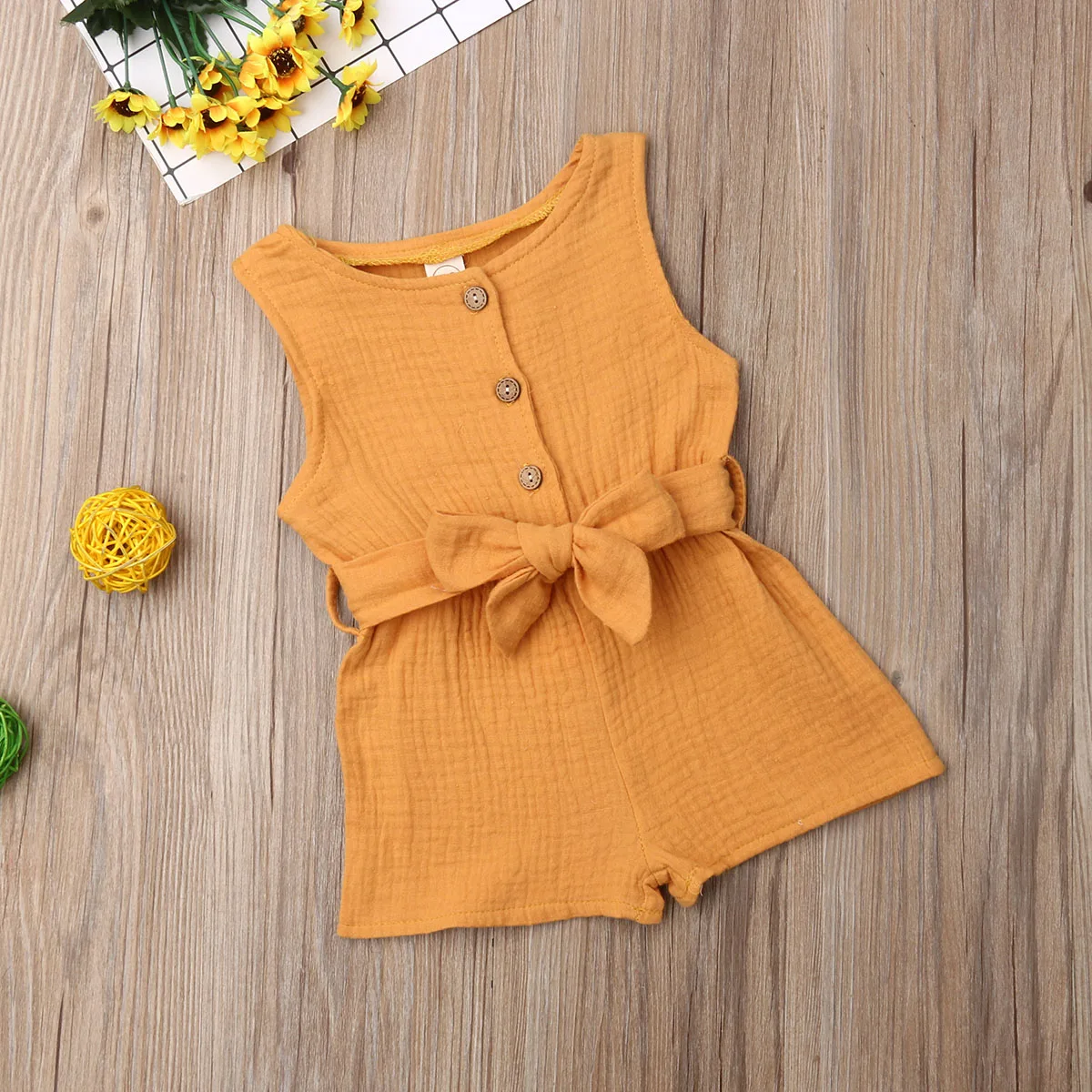 Летние комбинезоны для новорожденных; однотонные комбинезоны без рукавов с поясом; комбинезоны с бантиком; одежда; Милая популярная одежда; костюмы для девочек