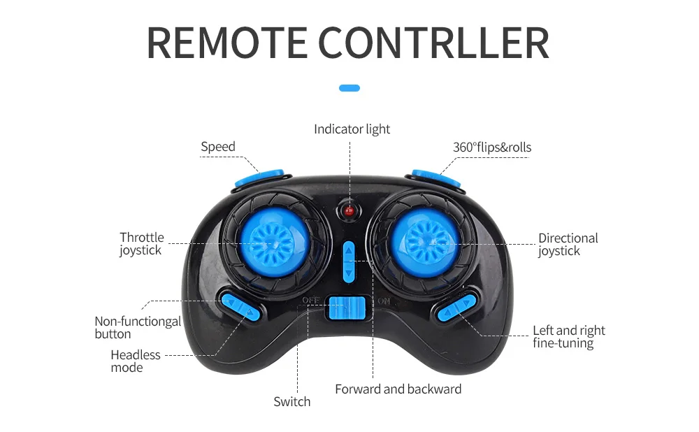 Функции:Вверх/вниз, вперед/назад, поворот влево/вправо, Скорость вверх, боковой полет, вращение на 360 градусов, замедление, 4D Eversion, Безголовый режим
