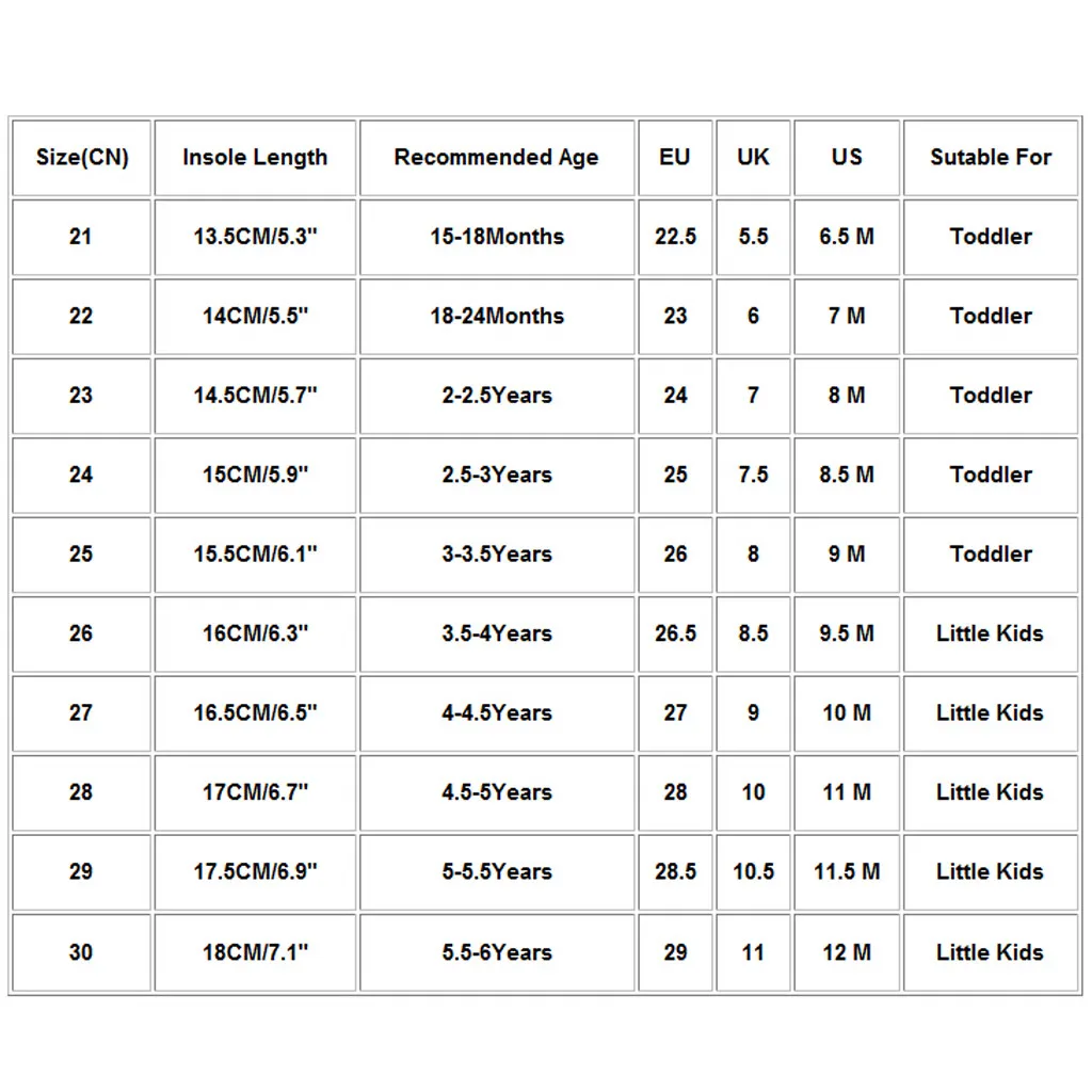 Размер (CN) Длина стельки Рекомендуемый возраст ЕС Великобритания США Sutable для 21 13,5 см/5,3 дюйма 15-18 месяцев 22,5 5,5 6,5 м Для малышей 22 14 см/5,5 дюйма 18-24 месяцев 23 6 7 м Для малышей 23 14,5 см/5,7 дюйма 2-2-5 лет 24 7 8 м Для малышей 24 15 см/5,9 дюйма 2,5-3 года 25 7,5 8,5 м Для малышей 25 15,5 см/6,1 дюйма 3-3,5 года 26 8 9 м Для малышей 26 16 см/6,3 дюйма 3,5-4 года 26,5 8,5 9,5 м Маленькие дети 27 16,5 см/6,5 дюйма 4-4,5 года 27 9 10 м Маленькие дети 28 17 см/6,7" 4,5-5 лет 28 10 11 м Маленькие дети 29 17,5 см/6,9 дюйма 5-5 лет 28,5 10,5 11,5 м Маленькие дети 30 18 см/7,1" 5,5-6 лет 29 11 12 м Маленькие дети