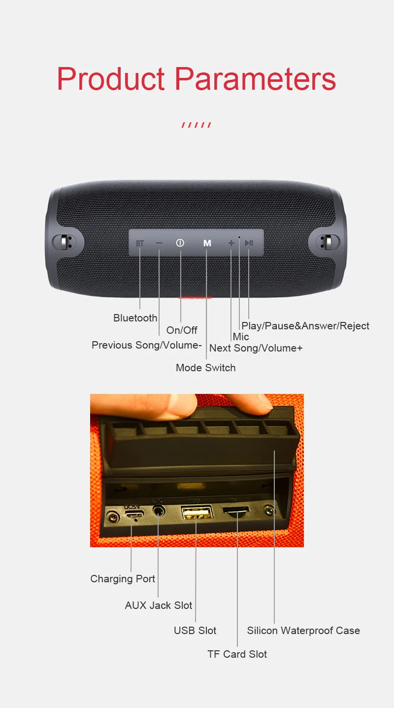1. Портативный съемный плечевой ремень длиной до 120 см. 2. Сетчатая крышка для защиты динамика от воды, пыли, ударов. 3. IPX5 водонепроницаемый, пыленепроницаемый, ударопрочный. 4. Большая мощность с двумя басовыми диафрагмами с каждой стороны, вибрирует при воспроизведении музыки. 5. Цилиндрическая форма и встроенный левый и правый канал обеспечивают 360 ° стерео. 6. Функция вызова, микрофон с шумоподавлением позволяет вам отвечать на звонки, не достигая телефона. 7. Fm-приемник позволяет свободно слушать радио. 8. Поддержка tf-карты или misro sd-карты до 32 г, поддержка AUX, поддержка USB 2,0 диска. 9. Функция TWS, вы можете подключить два динамика с помощью одной синхронизации телефона. 10. Простое кнопочное управление, вы можете нажимать кнопки для включения/выключения, воспроизведения/паузы, переключения режима, пропуска песен, регулировки громкости и т. Д. 11. Bluetooth 4,2, совместим со всеми устройствами Bluetooth. 12. Аккумулятор емкостью 1200 мА · ч обеспечивает до 10 часов воспроизведения при 2/3 громкости при полной зарядке. 13. Это не только динамик bluetooth, но и радио, проводной динамик, басовый бум.