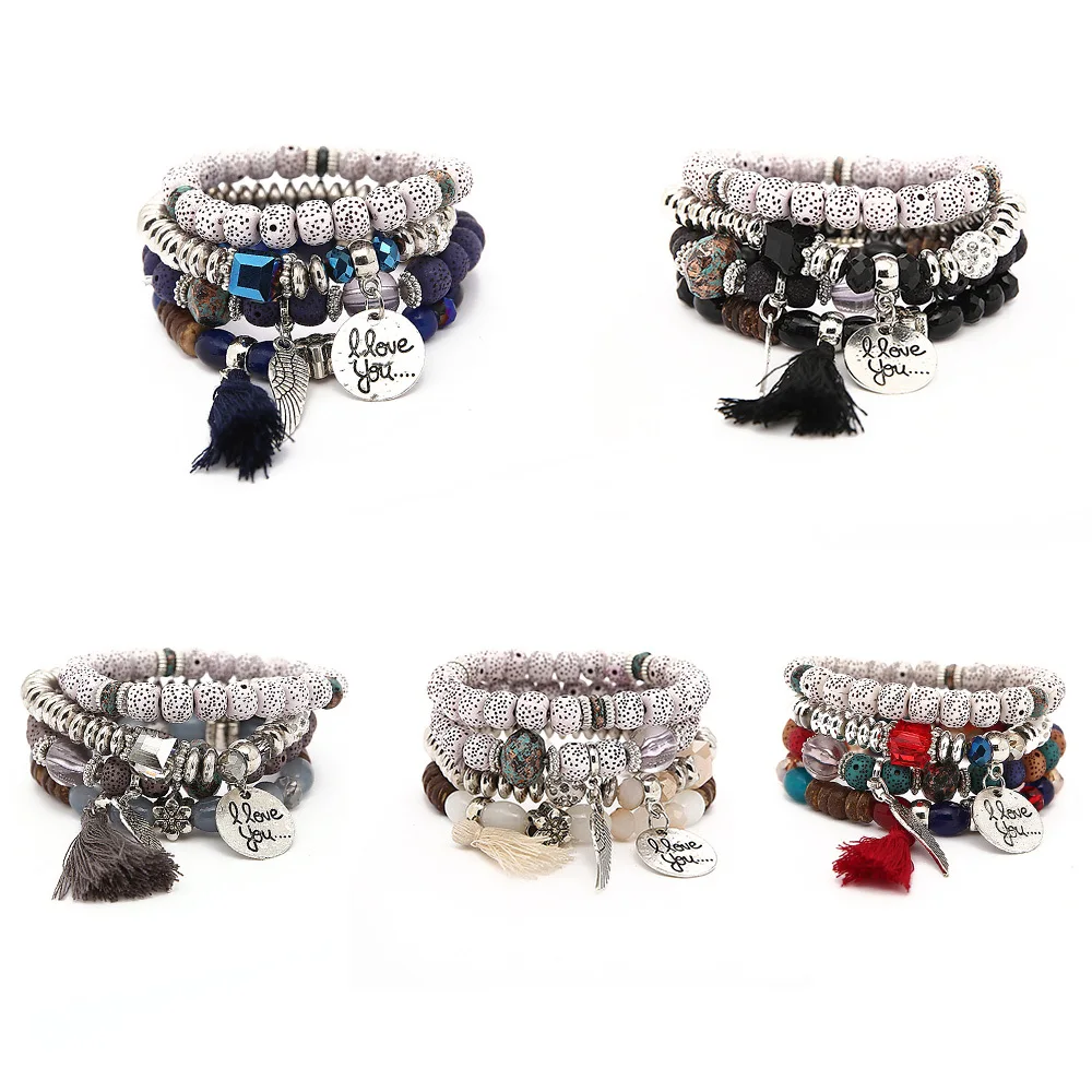 Модный комплект из 4 предметов, тянущийся браслет, женские круглые бусины, комплекты ювелирных изделий для вечеринок, очаровательные браслеты с кисточками из бисера, Золотое сердце, ювелирные изделия, подарки для вечеринок