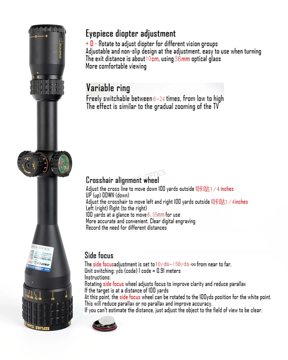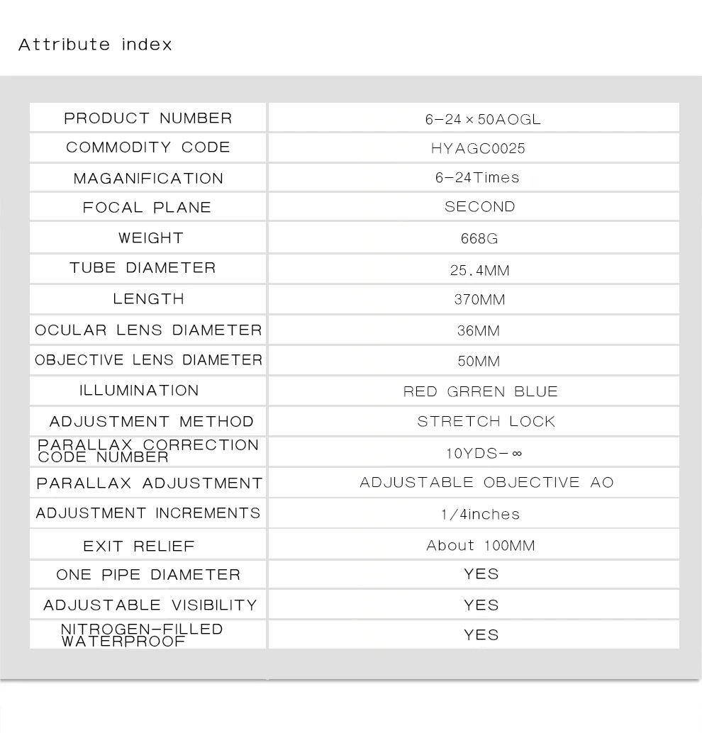Увеличение: 6X-24X Объектив (мм):50 Вес (г):670 Длина (мм):370 с солнцезащитным козырьком 446 мм Цельная трубка: Да Рельеф глаз (дюйм): 3,1-3,3 Диаметр трубки (мм/дюйм): 25,4/1 Поле зрения (ft @ 100yds) 16,1 ' - 4' Значение нажатия: 1/4 Parallax Настройка: от 10 до Inf