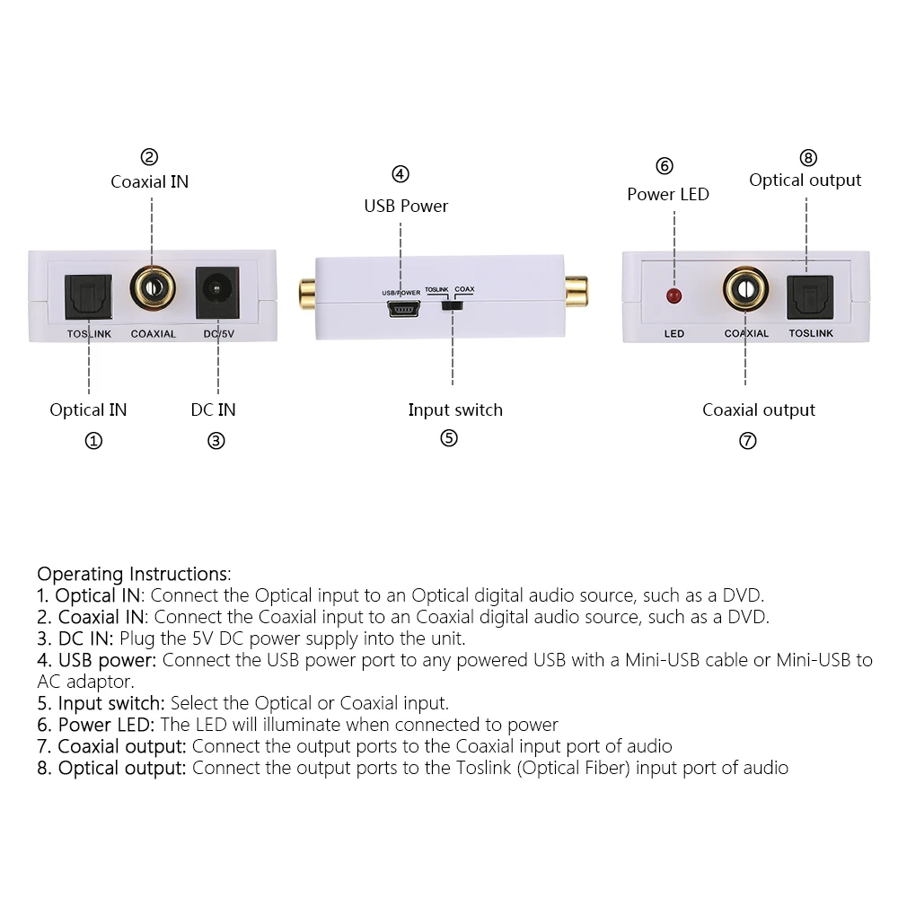 Цифровой 2-полосная аудио конвертер коаксиальный/Toslink аудио конвертер, компактный и удобный. Он принимает вход аудиосигнала S/PDIF через коаксиальный кабель или кабель Toslink и передает сигнал как на коаксиальные, так и на выходные порты Toslink. Благодаря встроенной функции усиления он также может служить ретранслятором звукового сигнала и увеличивать (двойное) расстояние передачи.