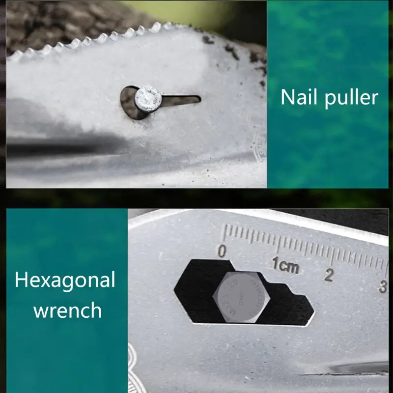4. Специальный материал из углеродистой стали с различными функциями, распиловка, резка, резка, лопата, гаечный ключ, гвоздь, линейка, защитное копье, до 8 видов, ручка зонта используется для связывания, интегрированного дизайна, избежать царапин.