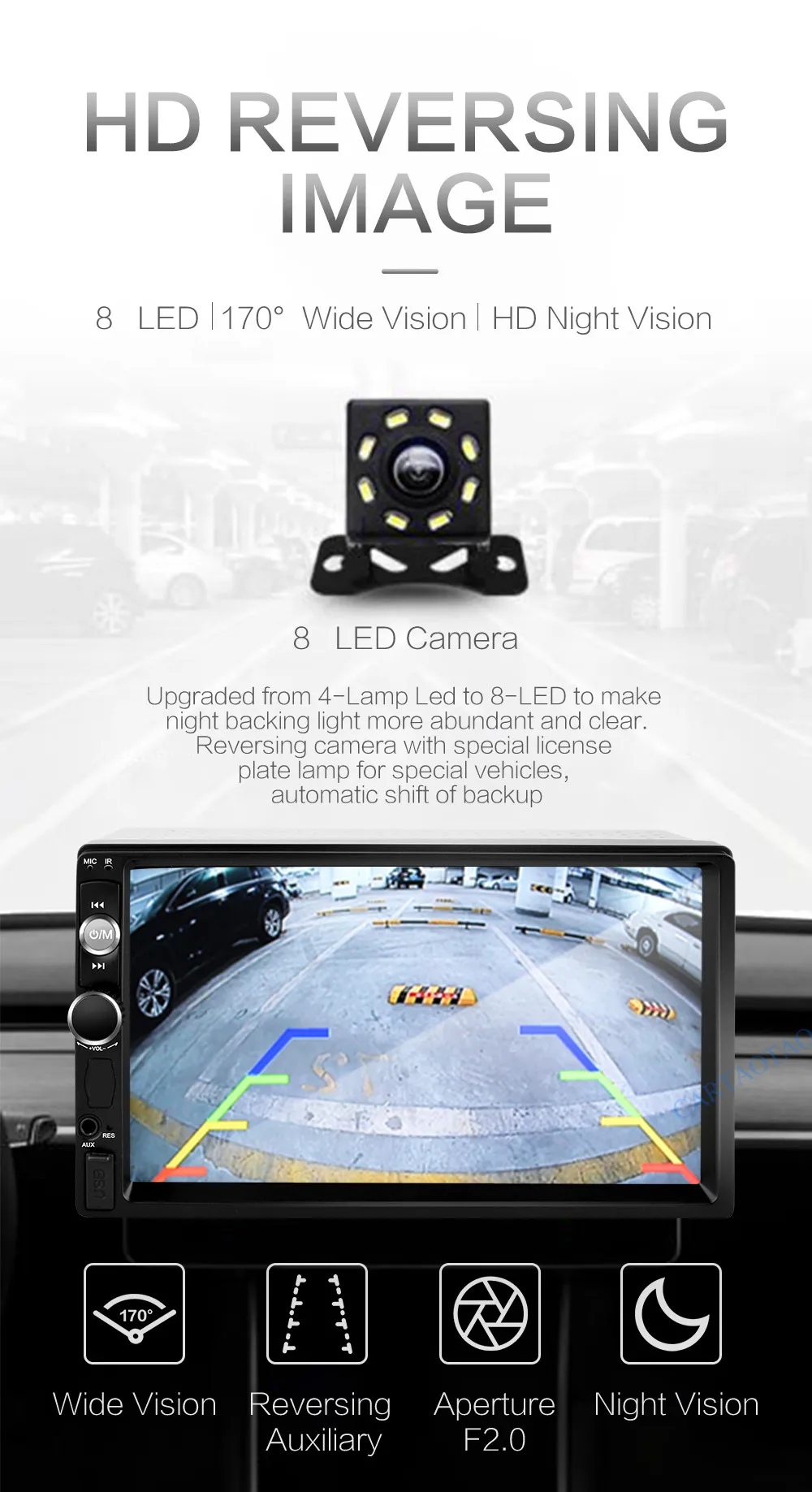 Передача заднего хода автоматически переключается на изображение заднего хода высокой четкости, что обеспечивает помощь через эффект заднего хода. Вы можете быстро и легко парковать автомобиль в правильном положении, что экономит много времени и снижает риск трения.