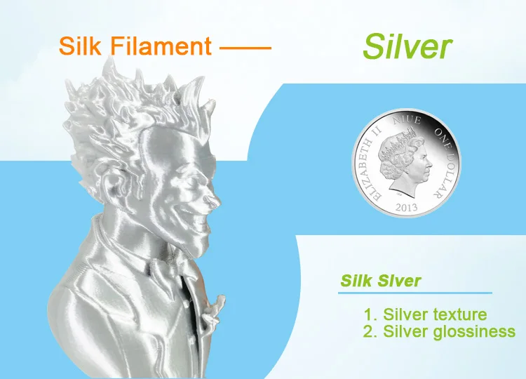 Шелк Скорость печати: 20 ~ 40 мм/сек. Температура печати: 200 ~ 220 ℃ Температура Нагревательного слоя: 20 ~ 50 ℃ Мраморный Скорость печати: 20 ~ 40 мм/сек. Температура печати: 190 ~ 220 ℃ Температура Нагревательного слоя: 20 ~ 50 ℃ Дерево Скорость печати: 20 ~ 40 мм/сек. Температура печати: 190 ~ 220 ℃ Температура Нагревательного слоя: 40 ~ 100 ℃ Изменение цвета (светится в темноте/светится/3 вида цветов) Скорость печати: 20 ~ 60 мм/сек. Температура печати: 190 ~ 220 ℃ Температура Нагревательного слоя: 0 ~ 50 ℃ PLA Скорость печати: 20 ~ 60 мм/сек. Температура печати: 190 ~ 220 ℃ Температура Нагревательного слоя: 0 ~ 50 ℃