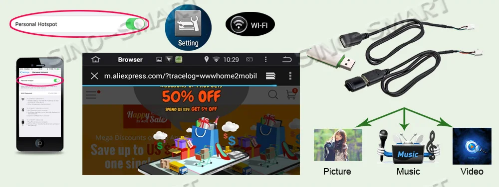 6. Встроенный WIFI (посетите Интернет через телефон hotpot) 7. Музыка и видеоплеер (воспроизведение музыки или видео онлайн, с usb-диска или встроенной памяти)