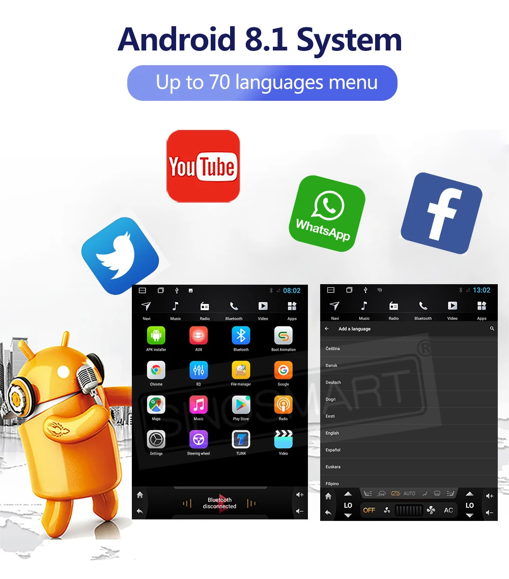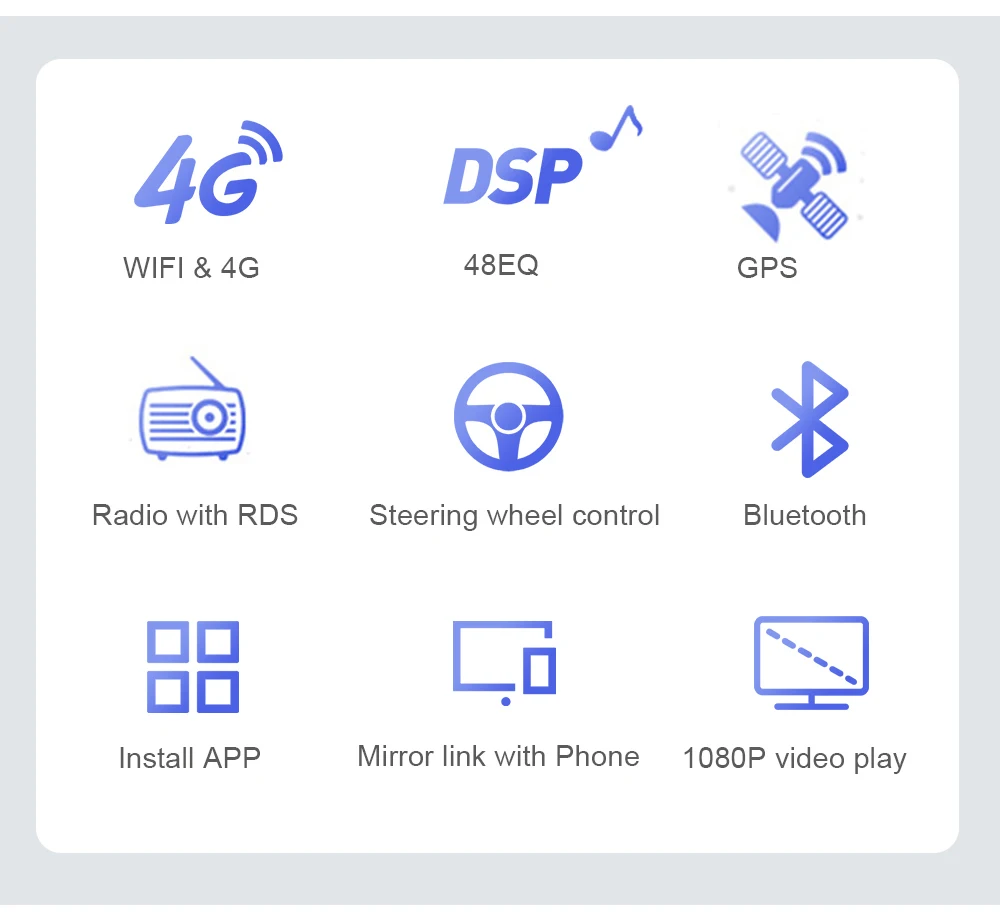 Встроенный WIFI/4G сеть, GPS, радио с RDS, поддержка кнопок управления рулем, Bluetooth для телефонных звонков/музыки и Bluetooth OBD, 1080P видео воспроизведения, зеркальная связь с телефоном. Загрузите и установите приложение, которое вам нравится.