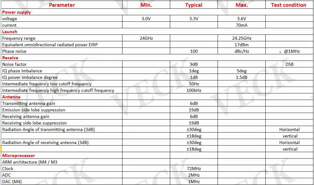 Рабочая частота: 24 ~ 24,25 ГГц Диапазон обнаружения: 0,3 ~ 6 м Максимальная эквивалентная всенаправленная Излучаемая мощность (EIRP):17dBm Фазовый шум: 100dBc/Гц @ 1 МГц Коэффициент приема шума: 9 дБ DSB Получить дисбаланс фазы IQ:<5deg Получение дисбаланса мощности IQ: <1,5 дБ Получить Максимальное усиление напряжения: 45 дБ 3,3 В одиночный источник питания, максимальный ток: 70 мА Размер: 25*25 мм
