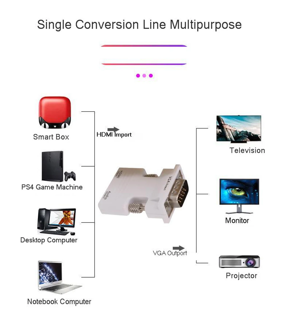 Продукты широко используются: настольные компьютеры/Ноутбуки/Мобильные телефоны/DVD/Планшеты/Цифровые приставки/плееры/Цифровые камеры/SLR камеры/камеры и другое оборудование HDMI-compitable вход источника сигнала, через это соединение, так что выход ТВ/монитора/проектора и другого оборудования дисплея. Таким образом, схема подключения устройства отображения пользователя решена.