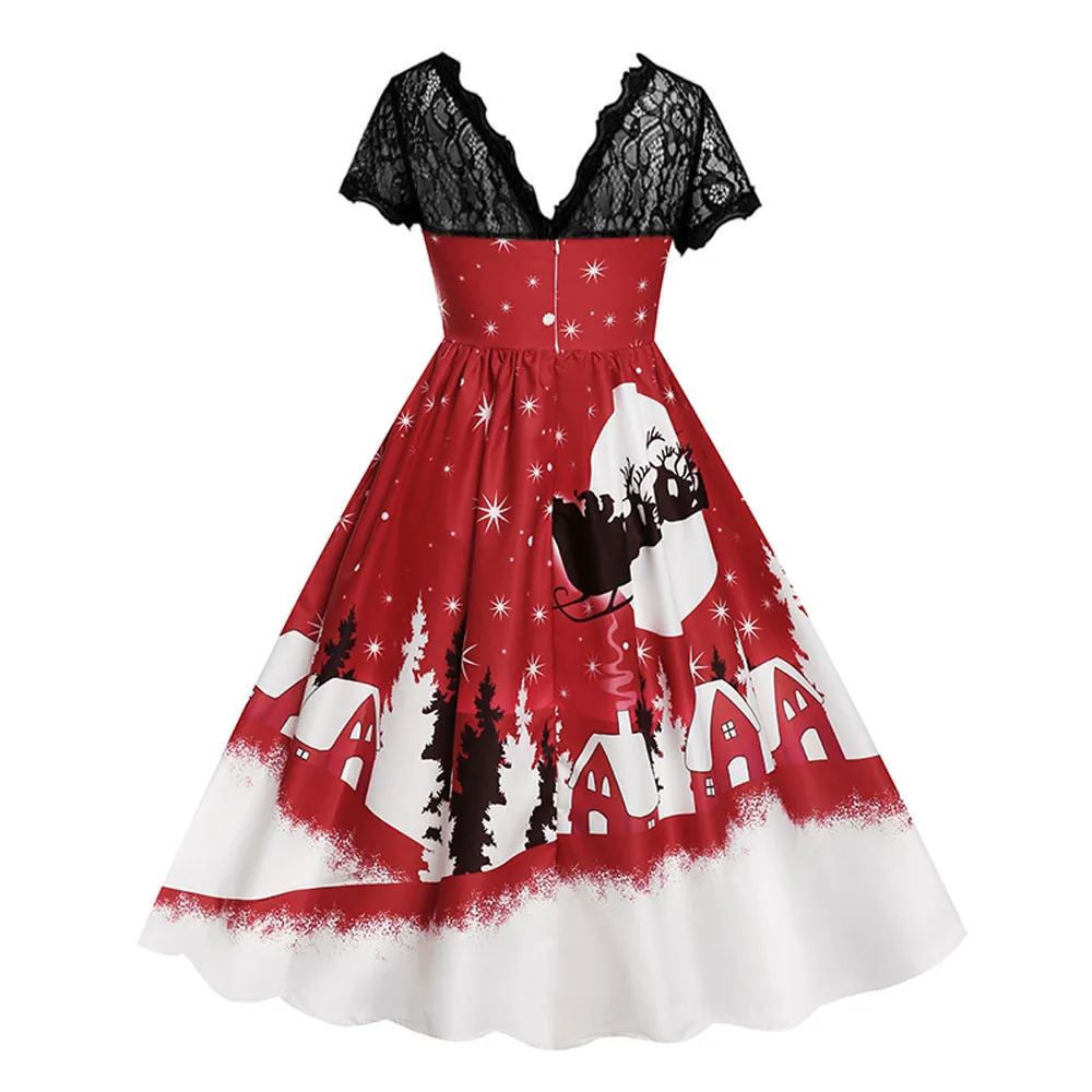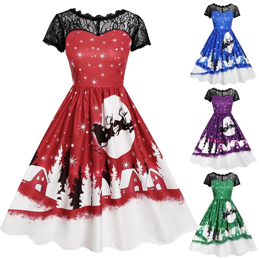 Винтажное платье с рождественской печатью и кружевной панелью, в готическом стиле, с высокой талией и расклешенным низом, может показать вашу тонкую талию и теленок, увеличивая кружевную панель показывает немного сексуальный, очень красивое пальто или галстук