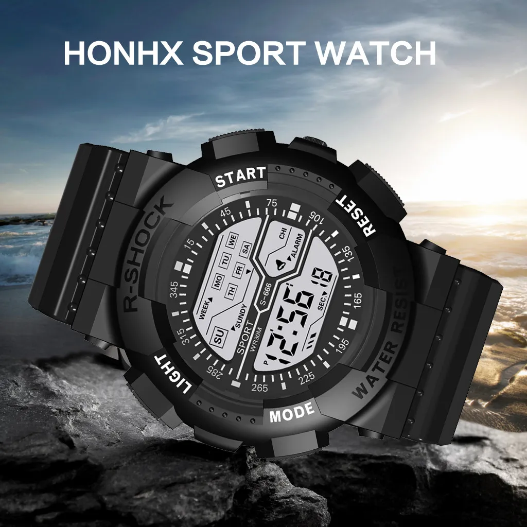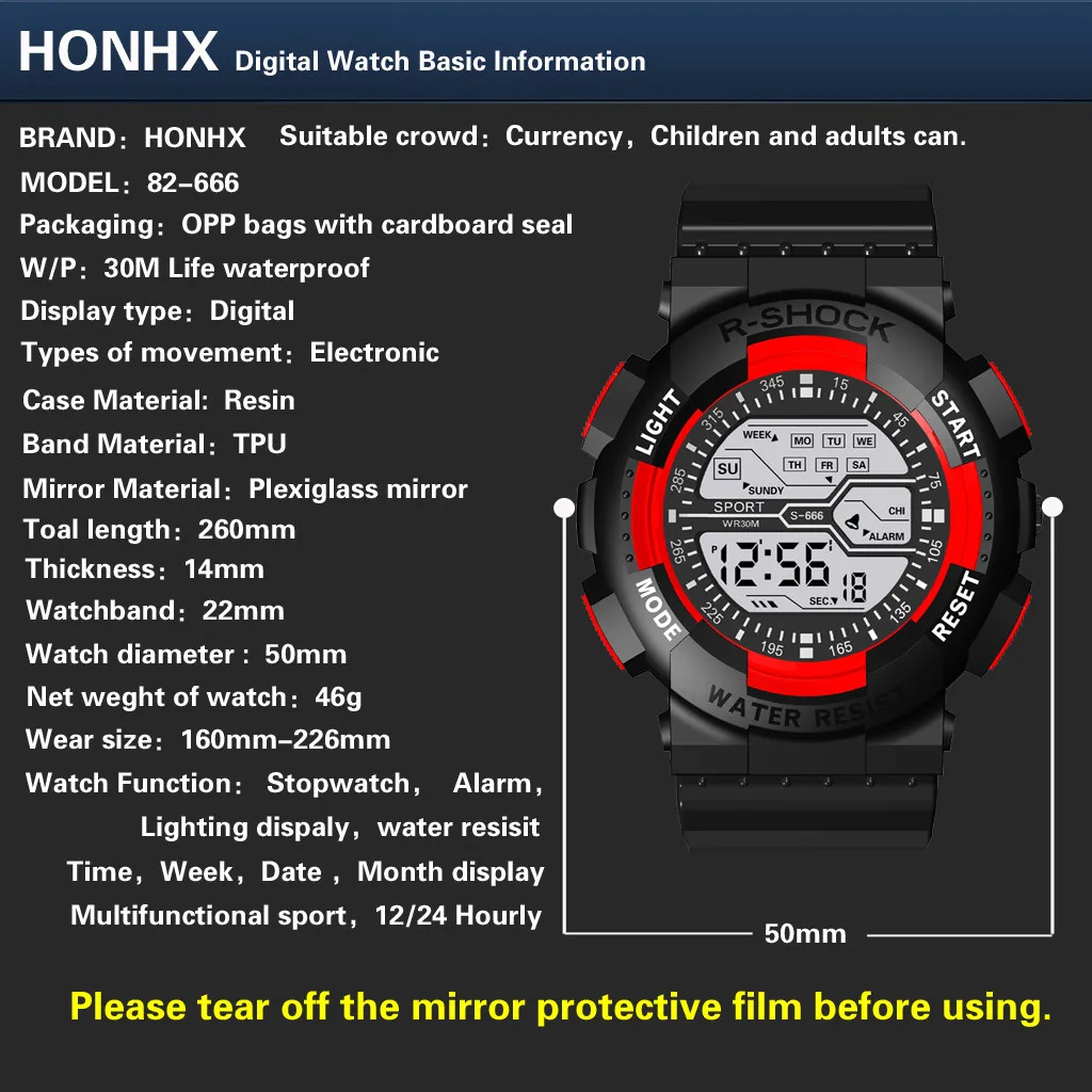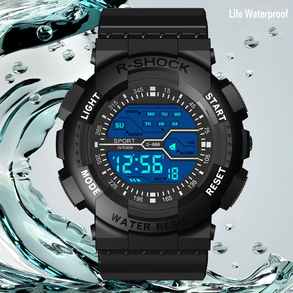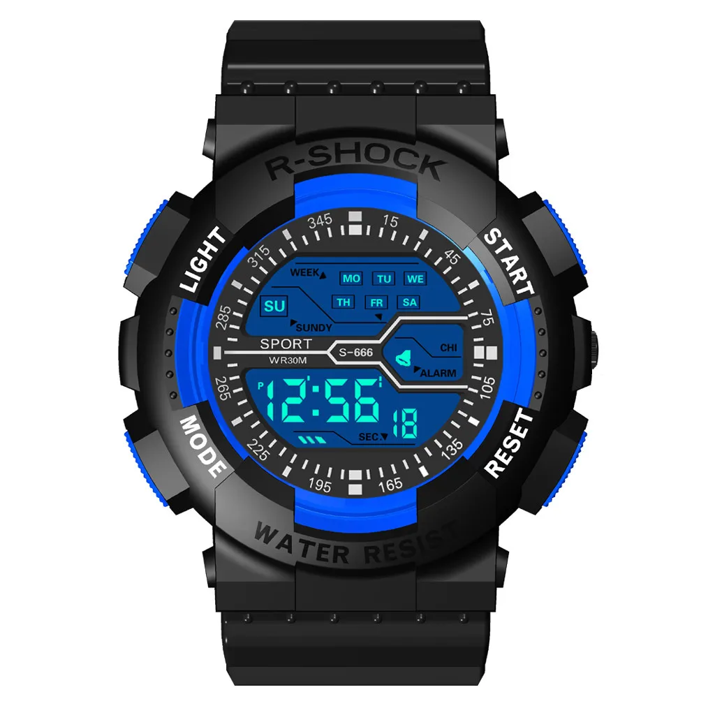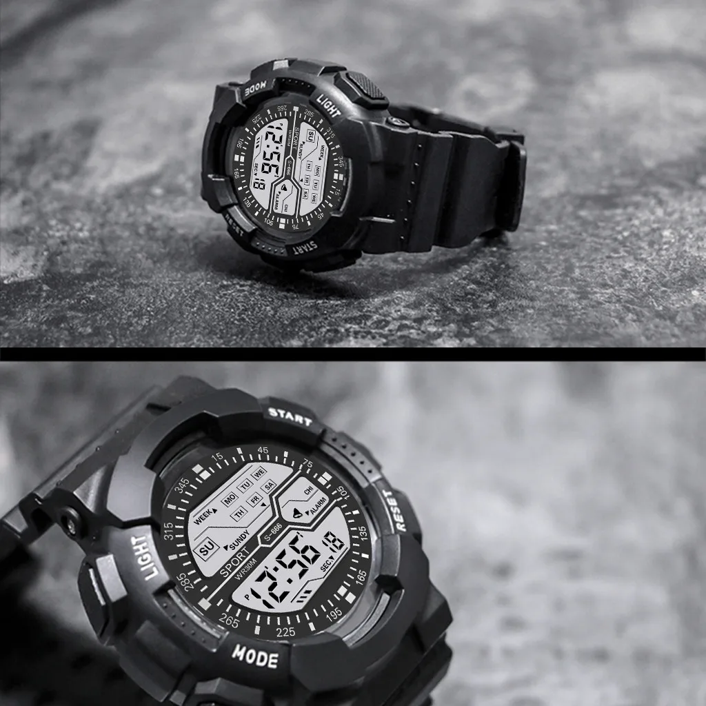 На открытом воздухе Многофункциональные спортивные часы, 30 м глубокие водонепроницаемые цифровые часы Выбор материала: пластиковый ремешок, высококачественное пластиковое зеркало, нижняя крышка из нержавеющей стали, Пряжка из нержавеющей сталиМодный стиль, многофункциональный дизайн, изысканное мастерство, а не Пропустите часы, стоит получить его и лучший выбор для подарков