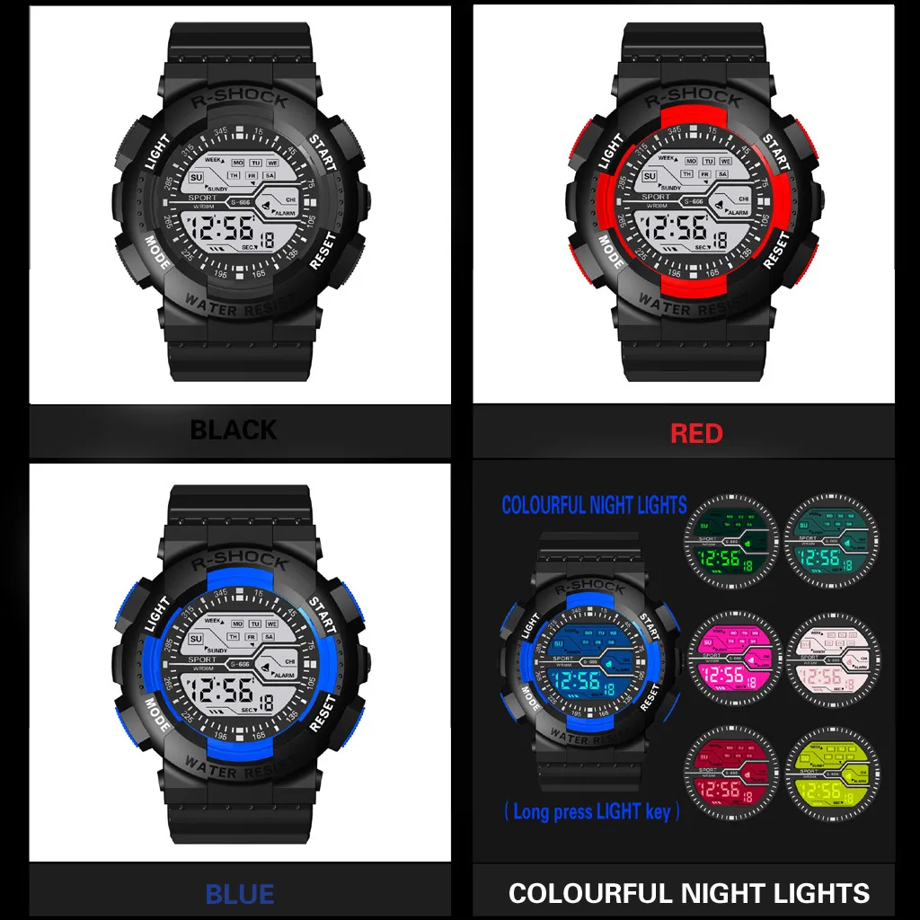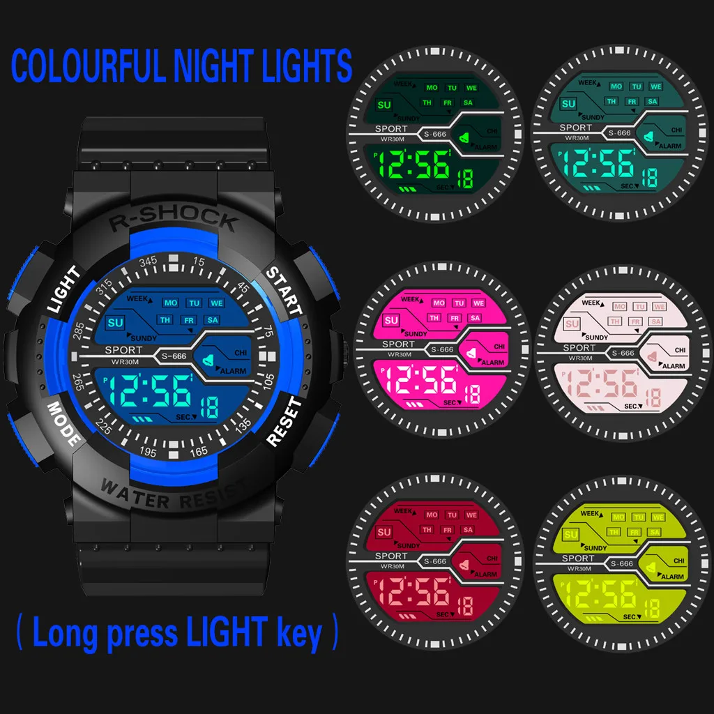 Семь цветов красочные светящиеся многофункциональные спортивные модные электронные часы