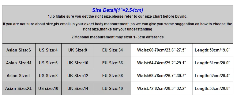 Азиатский размер: SРазмер США: 4Размер Великобритании: 8Европейский размер: 34Обхват талии: 60-70 см/23,6 "-27,5"Длина: 50 см/19,6 дюймаАзиатский размер: MРазмер США: 6Размер Великобритании: 10Европейский размер: 36Обхват талии: 64-74 см/25,2-29,1 дюймаДлина: 51 см/20,0 дюймаАзиатский размер: LРазмер США: 8Размер Великобритании: 12Европейский размер: 38Обхват талии: 68-78 см, 26,7-30,7 дюймаДлина: 52 см/20,4 дюймаАзиатский Размер: XLРазмер США: 10Размер Великобритании: 14Европейский размер: 40Обхват талии: 72-82 см/28,3-32,2 дюймаДлина: 53 см/20,8 дюйма