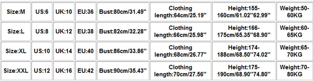 Размеры Свяжитесь с нами Великобритания ЕС Обхват груди Обхват талии Костюмы длина Высота Вес М 6 10 36 80 см/31,49" 66 см/25,98'' Высота голенища 64 см/25,19" 155-160 см/61,02 ''62.99" В переменного тока, 50-60 кг L 8 12 38 82 см/32,28'' 70 см/27,56'' 66 см/25,98'' 166-175 см/65,35 "68.90'' 60-65 кг XL 10 14 40 86 см/33,86'' 74 см/29,13'' 68 см/26,77" 174-188 см/68,50 ''74.02'' 65-70 кг XXL 12 16 42 90 см/35,43'' 78 см/30,71'' 70 см/27,56'' 175-190 см/68,90 ''74.80'' 70-80 кг