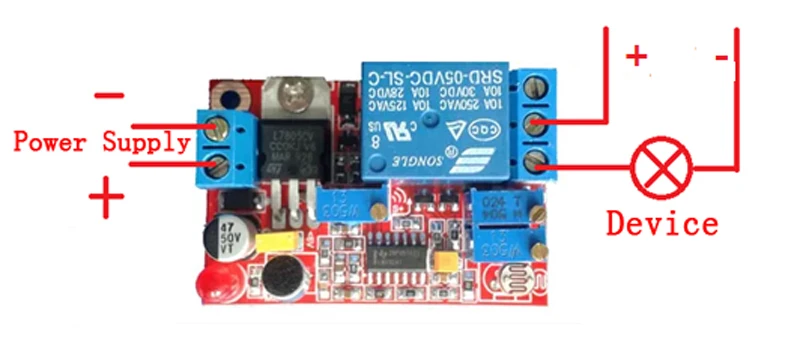 4. В относительно тихой среде, отладка, интенсивность кнопки регулировки порога чувствительность звука увеличивает чувствительность по часовой стрелке против часовой стрелки. Сначала Регулировка по часовой стрелке, чтобы реле не было закрыто (светодиодный). Затем говорите или хлопайте, наблюдайте, как светодиодный индикатор горит (из-за того, что он был перенесен короче, а затем немедленно выключен). Постепенно регулируйте чувствительность до тех пор, пока она вам не понадобится.