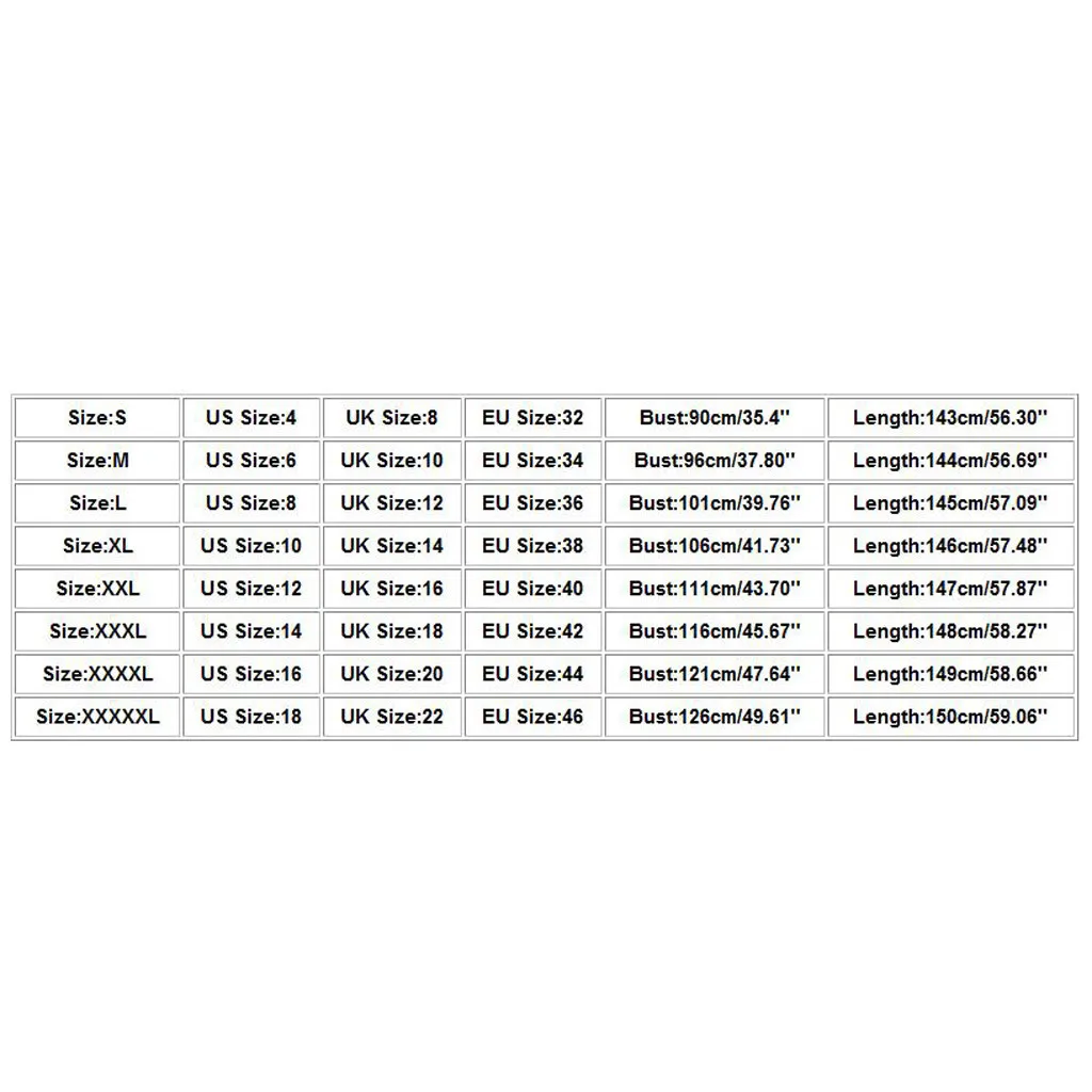 Пожалуйста, сравните размеры деталей с вашими перед покупкой!Цвета могут немного отличаться в зависимости от настроек компьютера и монитораПожалуйста, примите во внимание возможную погрешность в 1-3 см из-за ручного измерения. Спасибо! (все размеры указаны в см, 1 см = 0,39 дюйма)Таблица размеров:РазмерРазмер СШАРазмер ВеликобританииЕвропейский размерБюстДлинаS483292 см/36,22 дюйма140 см/55,12 дюймаМ6103496 см/37,80 дюйма141 см/55,51 дюймаL8123697 см/38,19 дюйма142 см/55,91 дюймаXL10143898 см/38,58 дюйма143 см/56,30 дюймаXXL12164099 см/38,98 дюйма144 см/56,69 дюймаXХХL141842101 см/39,76 дюйма145 см/57,09 дюймаXXXXL162044102 см/40,16 дюйма146 см/57,48 дюймаXXXXXL182246103 см/40,55 дюйма147 см/57,87 дюйма