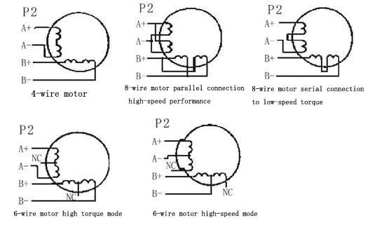 В FMD2740A водитель может управлять всеми ток 4A 4-проводной, 6 проводов или 8-жильный 2-фазный/4-фазами, приводятся ниже 4-проводной, 6 проводов, 8 проводов шагового двигателя подключение: