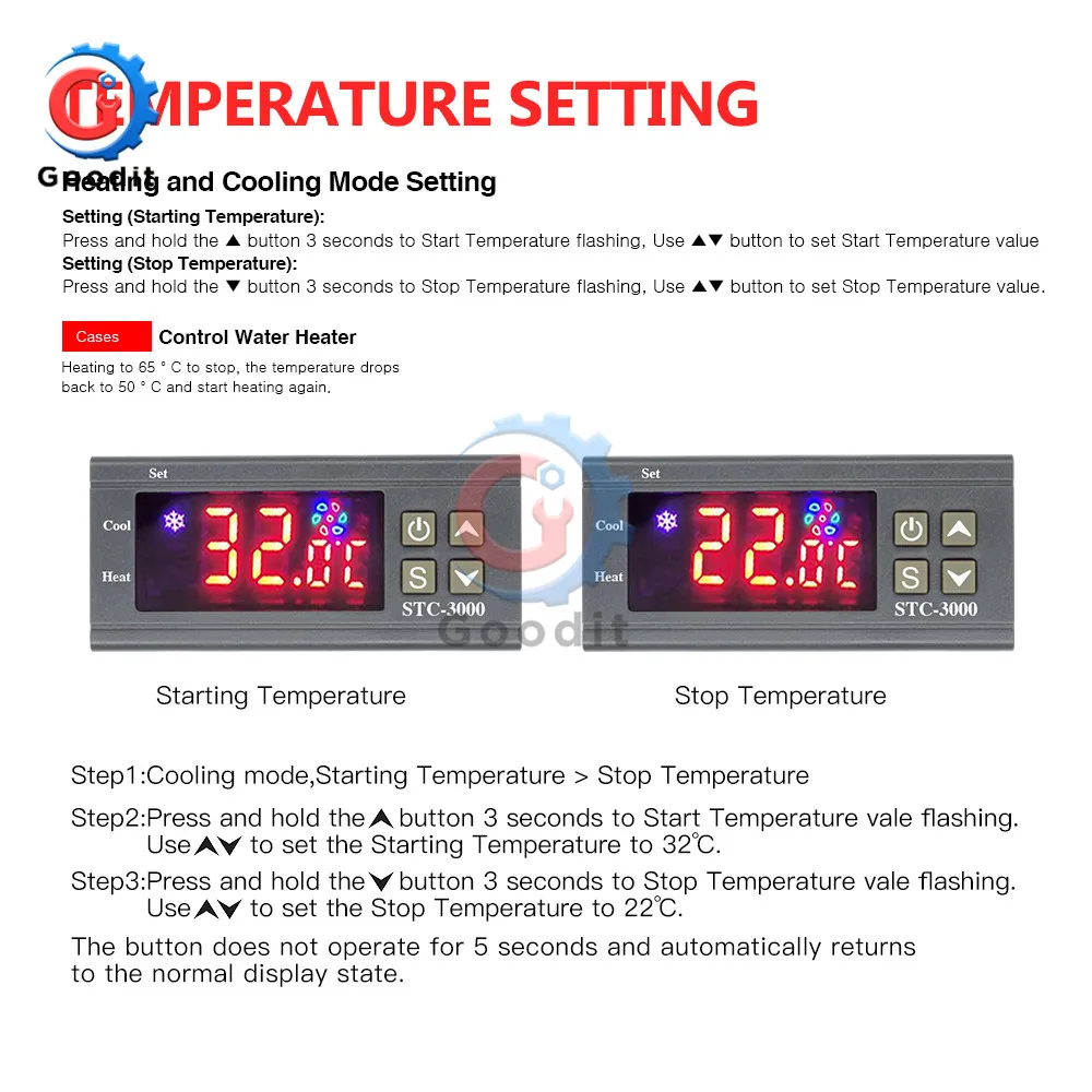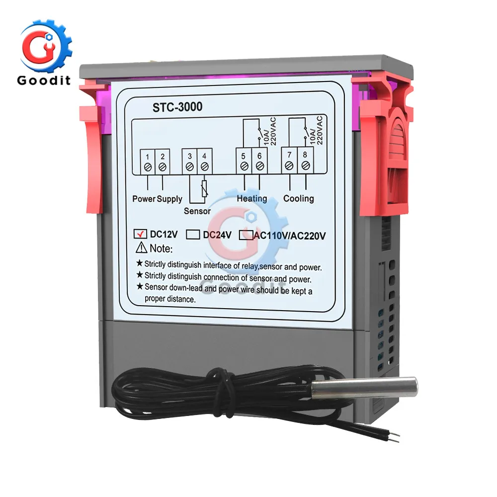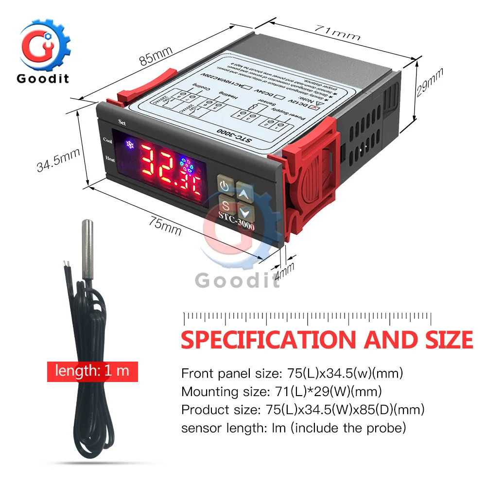 Основные инструкции: Переключение режимов между прохладным и тепловым; Контроль температуры Установка значения настройки температуры и значения разницы; Температура калибровки; Предохранение от задержки выхода управления efrigerating; Сигнал тревоги когда Температура превышает Температурный Предел или при ошибке датчика. Параметры и Размеры: Размер передней панели: 75(L) x34,5 (w)(мм) Размер крепления: 71 (Д) * 29 (Ш) (мм) Размер изделия: 75(L) x34,5 (W)x85(D)(мм) Длина датчика: Im (включая зонд) Технические параметры: Диапазон измерения температуры: 50C-99C Разрешение: 0.1C Точность: + 1 C(-50C-70 C) Задержка срабатывания датчика: l minute Мощность питания: 110V/220VAC + 10% В переменного тока, 50/60 Гц Потребляемая мощность: <3 Вт Датчик: Датчик NTC (IPC) Контактная мощность реле: холодный (10А/250В переменного тока); Тепло (10А/250В переменного тока) Температура окружающей среды: 0C-60 C Температура хранения: -30C-75 Относительная влажность: 20-85% (без конденсата) Панель инструкция Посылка включает в себя: 1 шт. * контроллер температуры 1 шт. * Датчик температуры 1 шт. * Руководство по эксплуатации