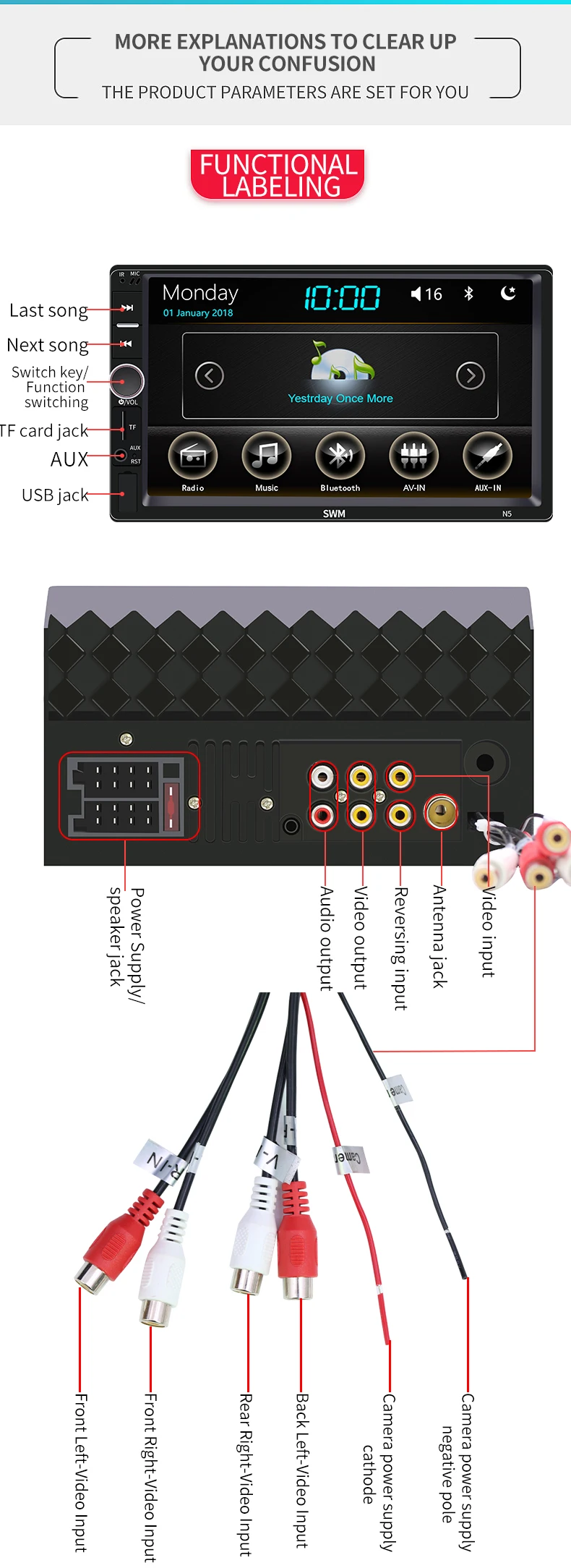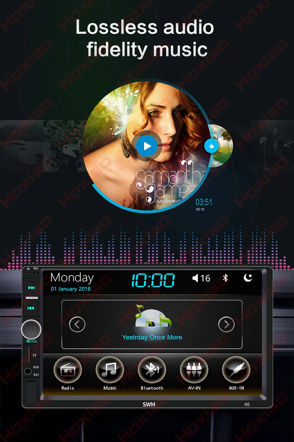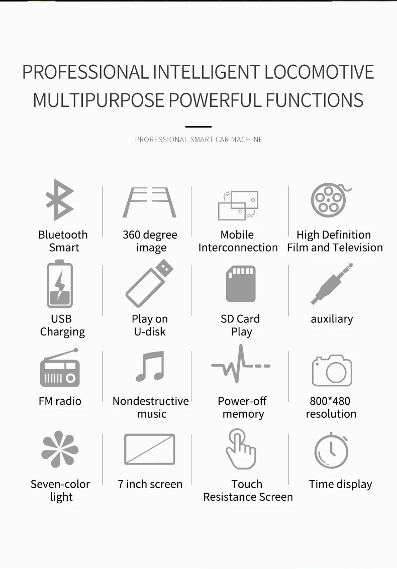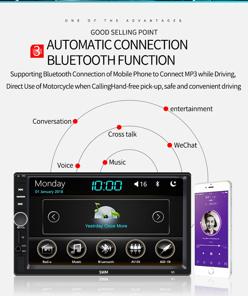 Поддержка аудиоформата: MP3/WMA/WAV/APE/FLAC Поддержка видео формата: RM/RMVB/AVI/MP4/MKV/3GP (в пределах 720p) Версия Bluetooth 4,0, поддержка воспроизведения музыки по Bluetooth