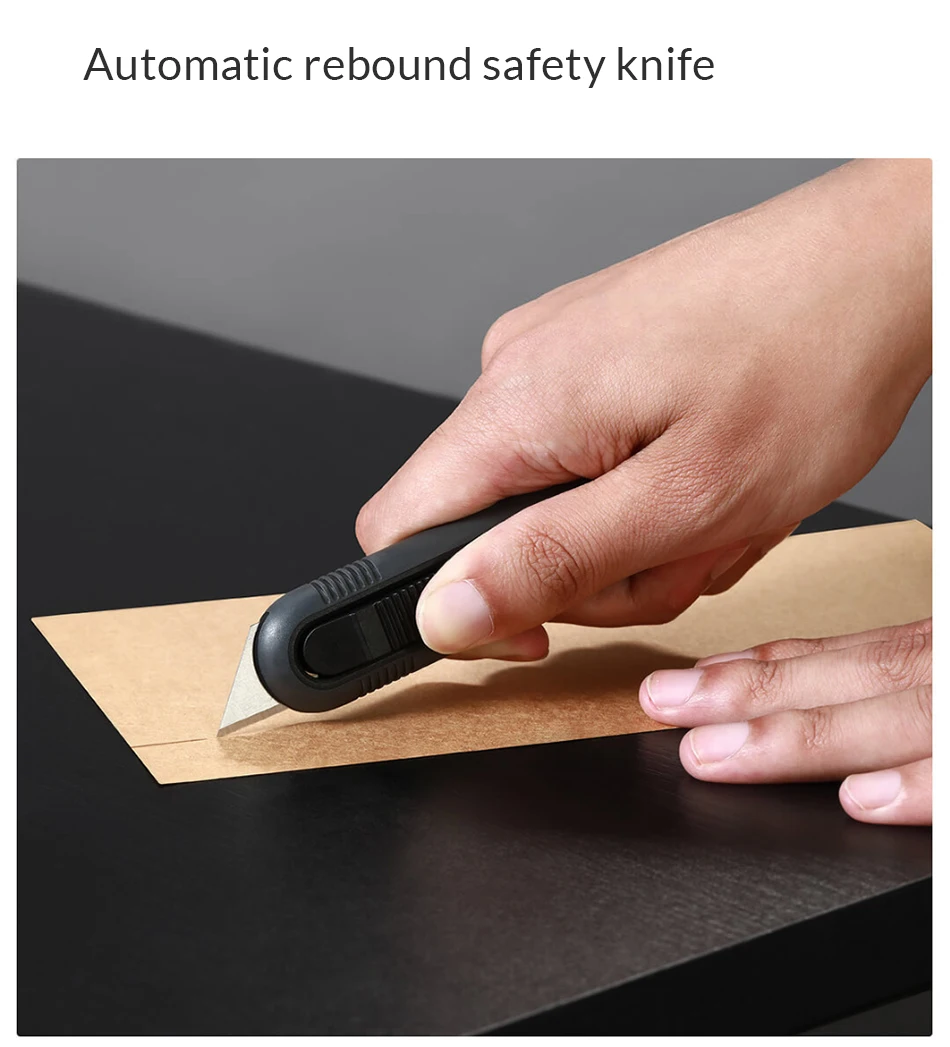 Безопасный нож не только имеет основные функции резки, резьбы и штамповки обычных канцелярских ножей, но и с точки зрения безопасности, лезвие должно быть выставлено толкателем на хвостовике, и если толкатель высвобожден, лезвие автоматически возвращается на рукоятку.