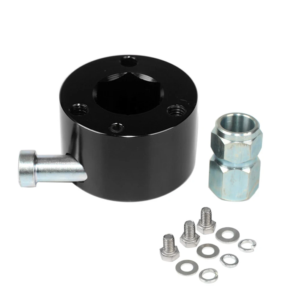 Алюминиевый концентратор. 3/4 "Диаметр отверстия. Шестигранные стальные оправы должны быть сварены до 3/4 "круглого вала. 1-1/2 "расстояние между болтами рулевого колеса. Подходит для большинства послепродажных рулевых колес с 3 отверстиями