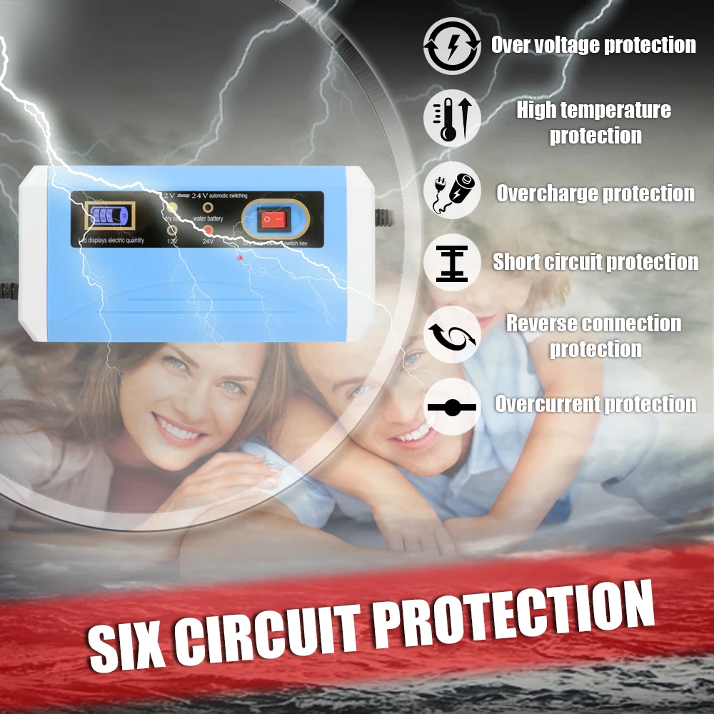 С защитой от перезаряда, высокой температурной защитой, защитой от перегрузки по току, защитой от обратного подключения, защитой от короткого замыкания и защитой от перенапряжения.