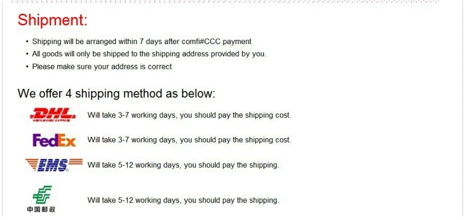 Если вам необходимо срочно получить свой заказ, пожалуйста, выберите Экспресс-способ, но вы должны оплатить стоимость доставки.
