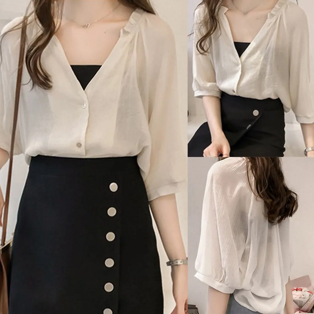Летние женские модные полурукава v-образные вырезы Однотонная футболка Свободная блузка