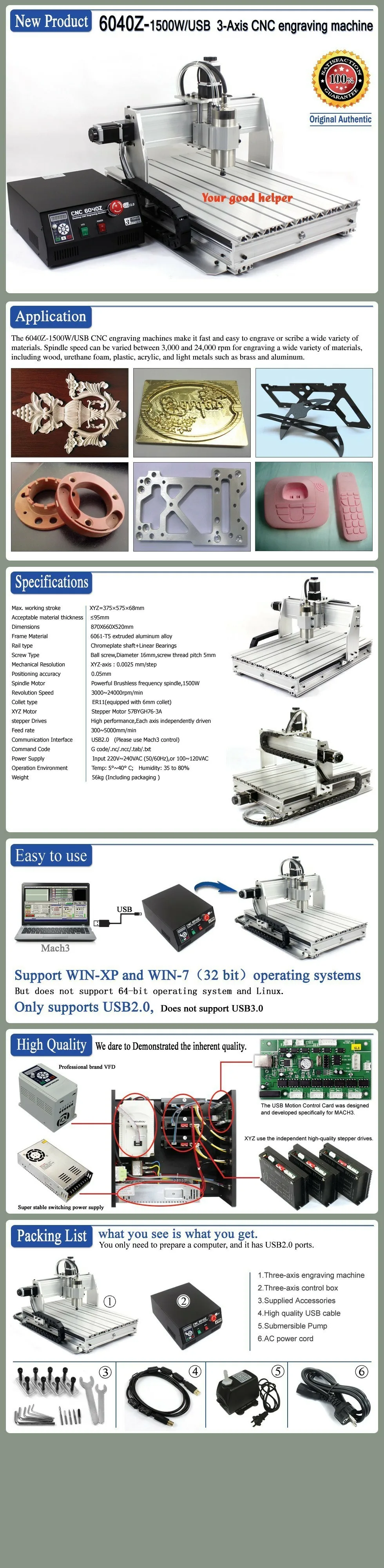 Гравировальные Машины с ЧПУ 6040Z-1500W/USB делают их быстрыми и простыми в гравировке или написании различных материалов. Скорость вращения шпинделя может быть варьируется от 3000 и 24000 об/мин для лазерной гравировки широкий различные материалы, в том числе древесину, пенопласт, пластик, акрил, а также светильник металлы, такие как латунь и алюминий.