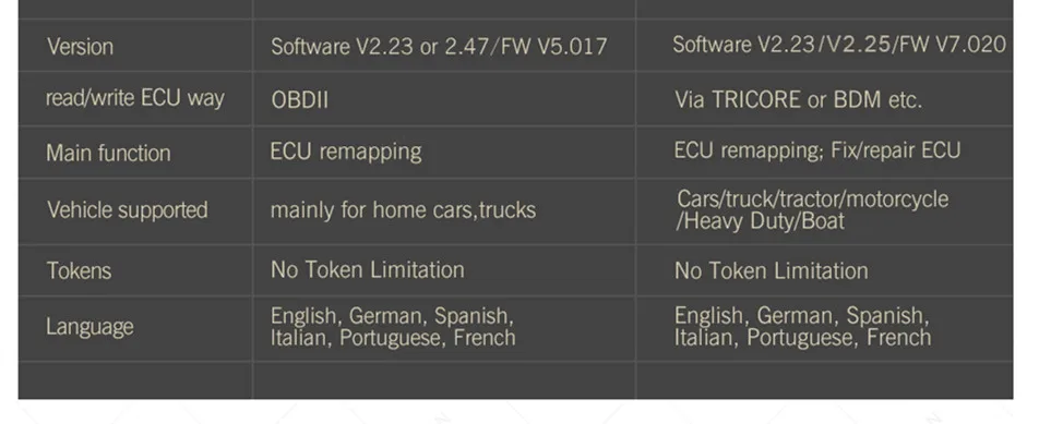 Пожалуйста, не обновляйте онлайн, это повредит устройство и не может использовать больше. При запуске программного обеспечения закройте антивирусную программу. Какие различия между 5,017 и 7,020? Если вы в основном хотите работать на 24V грузовиках и тракторах, V7.020 больше подходит для вас! 1. Различные способы подключения: Для V5.017, он может читать и писать ECU через OBD2 кабель непосредственно для большинства транспортных средств, прост в эксплуатации. Для V7.020, он считывает и записывает ECU через TRICORE или BDM или другой режим со специальным кабелем, программное обеспечение будет направлять вас, как работать. 2. Различное покрытие транспортного средства: Например: 5,017 и V7.020 все могут работать для большинства для Toyota Denso ECU протокол, но только 7,020 может работать для Toyota Hilux kun26 очень хорошо! V7.020 может поддерживать гораздо больше грузовиков/тракторов/мотоциклов, чем V5.017! Для некоторых автомобилей. V5.017 просто можете прочитать его. Но V7.020 может читать и писать его.