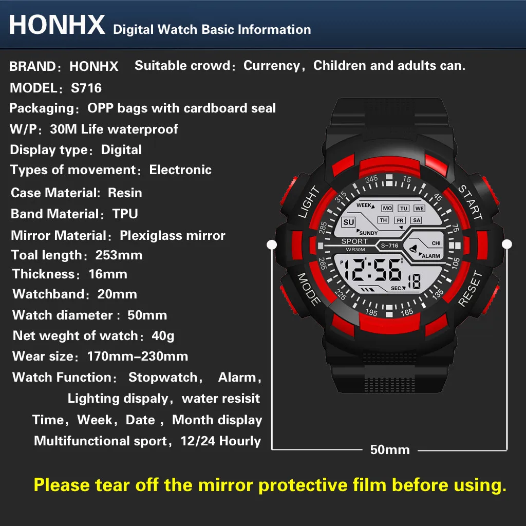 На открытом воздухе Многофункциональные спортивные часы, 30 м глубокие водонепроницаемые цифровые часы Выбор материала: пластиковый ремешок, высококачественное пластиковое зеркало, нижняя крышка из нержавеющей стали, Пряжка из нержавеющей сталиМодный стиль, многофункциональный дизайн, изысканное мастерство, а не Пропустите часы, стоит получить его и лучший выбор для подарков
