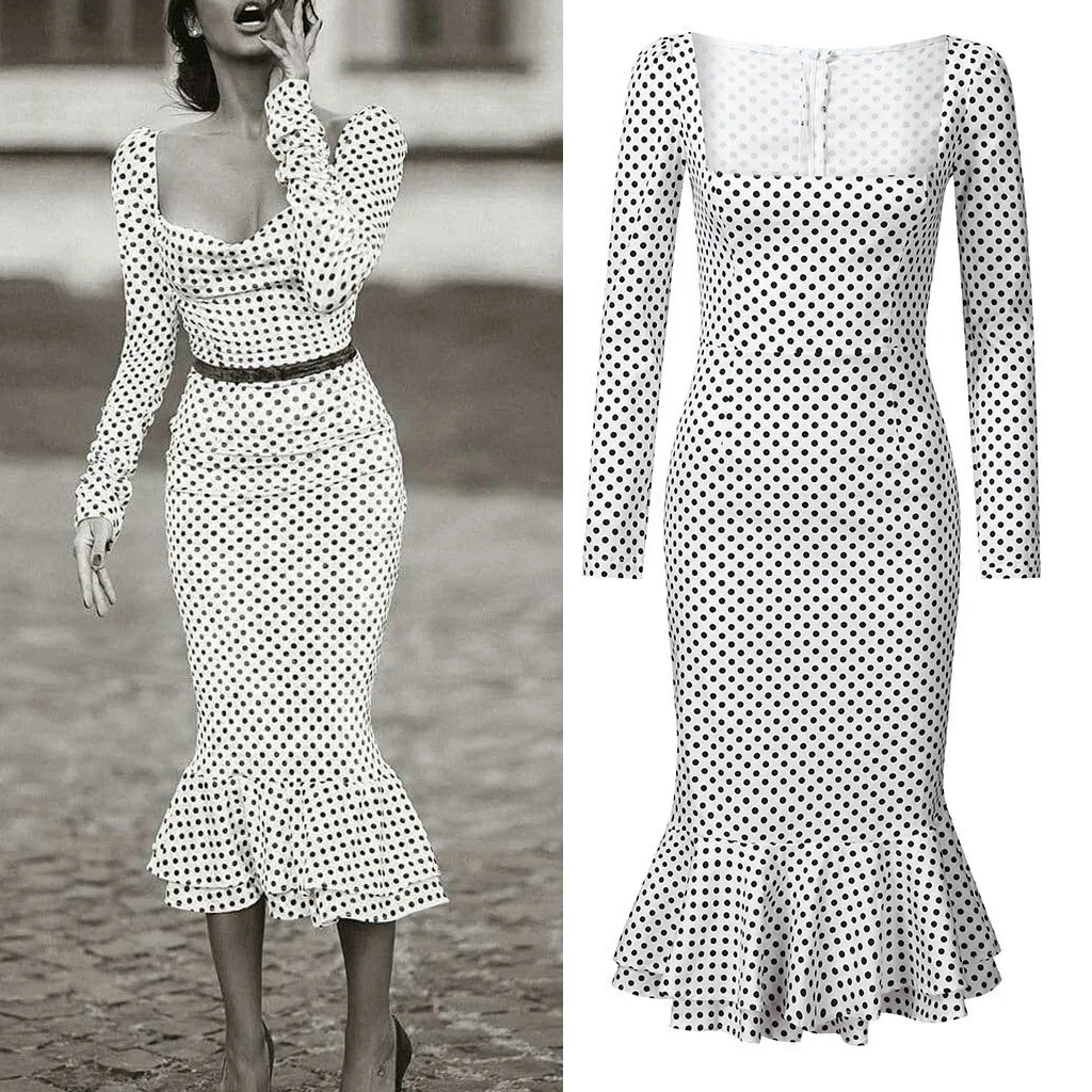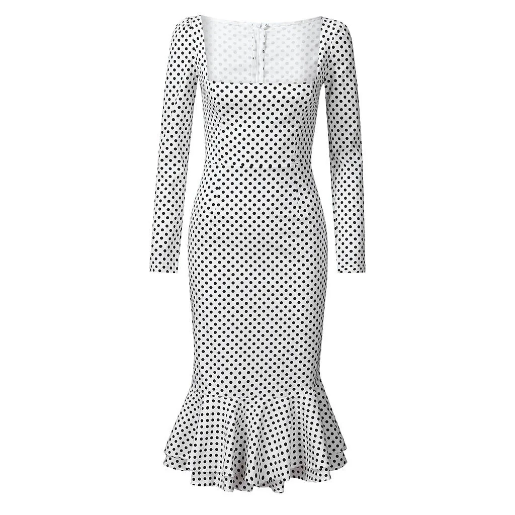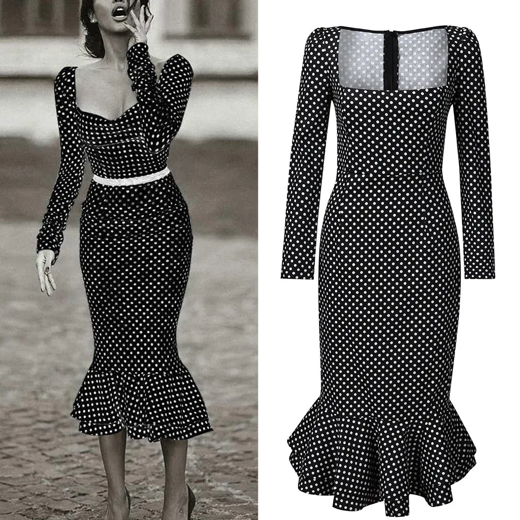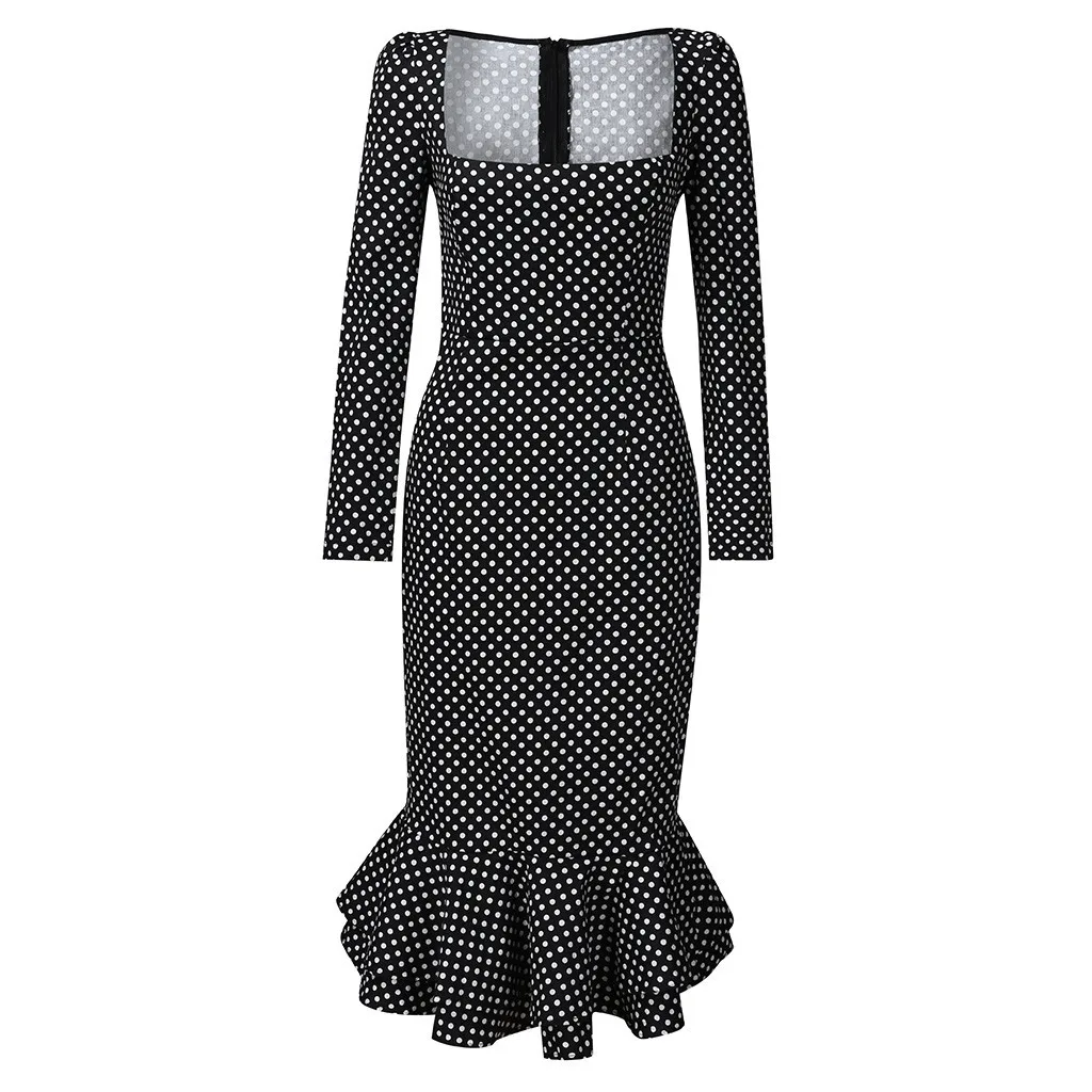Женское платье с длинным рукавом и квадратным воротником в горошек печатных обтягивающее коктейльное платье, платье на выпускной