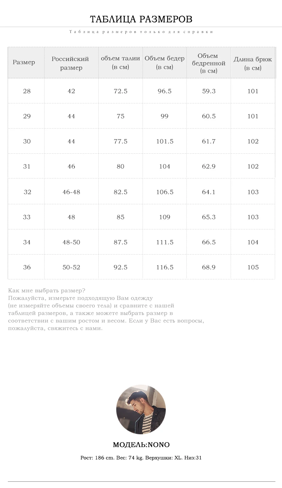 Советы: Это китайский размер, который может быть на 1-2 размера меньше, чем размер вашей страны, Пожалуйста, измерьте ваши подходящие брюки, чтобы сравнить с нашей таблицей размеров, если вы не уверены в размере, пожалуйста, не стесняйтесь связаться с нами, мы дадим вам некоторые советы.