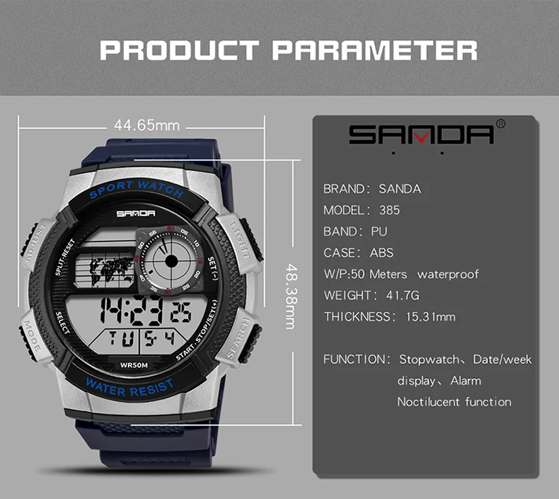 Марка: SANDA Часы категории: Для мужчин Стиль часов: Модный спортивный Особенности: водонепроницаемый, задний свет, будильник, календарь, светодиодный дисплей, светящийся, плавать Размер Длина Часов: около 24 см Диаметр: около 44,65 мм Ширина ремешка: около 15,31 мм Посылка 1x Смотреть (Размер измеряется вручную, допускается погрешность в 1-3 см, только для справки. Просим отнестись с пониманием) Купите более 5 шт., мы предоставим вам скидку 5%!