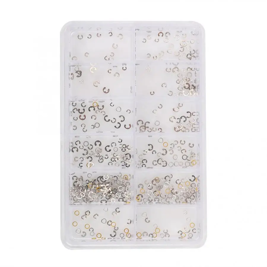 Включая в общей сложности 12 размеров, удовлетворяя ваши различные требования. Поставляется с пластиковой коробкой для хранения, легко носить с собой и хранить, очень удобно. Изготовлен из качественного металлического материала, прочный и прочный, имеет долгий срок службы. Подходит для часов и ремонтных работников. Это тип крепежа, используемый в слоте вала часов, чтобы предотвратить осевое движение деталей на валу.
