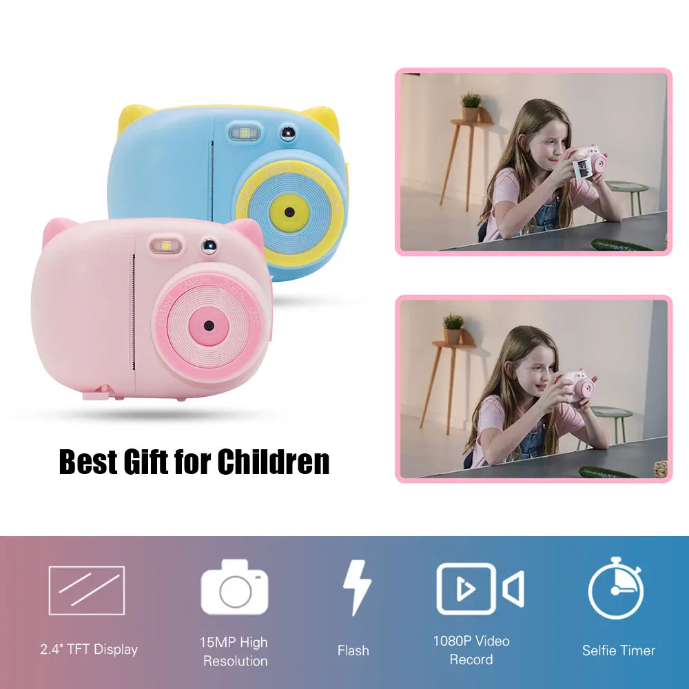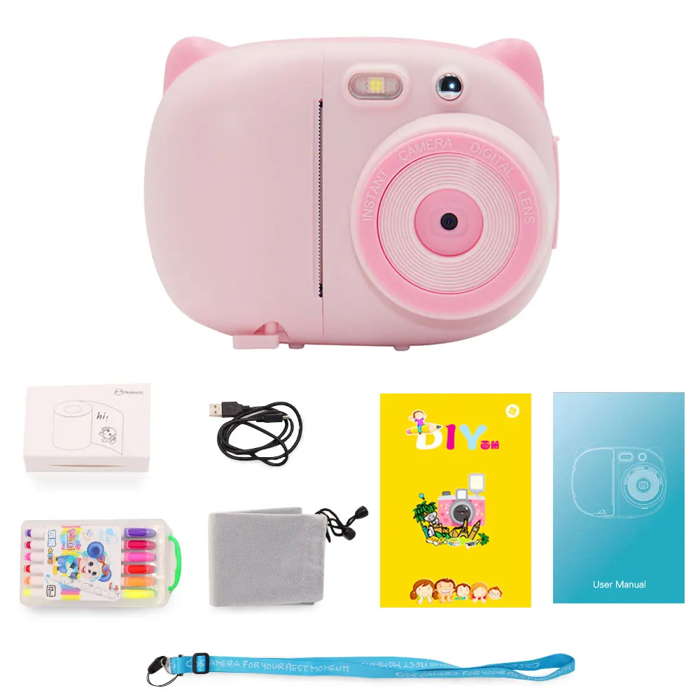 Мгновенный напечатанные картины:Может осуществить фотографирование и печать мгновенно, Напечатанные изображения в черном и белом цвете, регулируемая концентрация чернил; поставляется с набором фломастеры, дети могут заполнять цвета в соответствии с их воображением, затем можно наклеить напечатанные картинки на подарочный альбом, делая свой собственный специальный альбом.