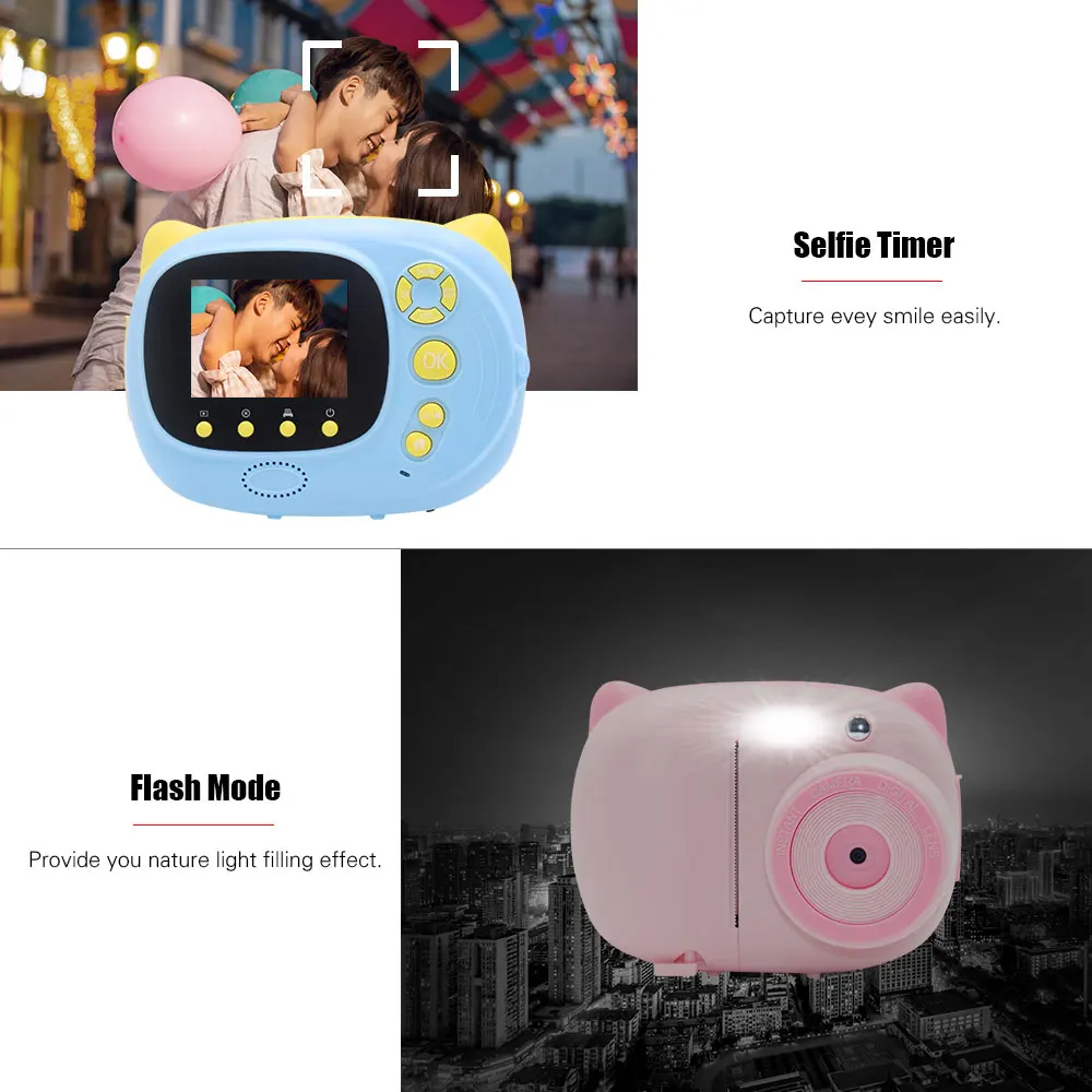 Несколько функций:Поддержка подключения Wi-Fi, может синхронизировать съемку с мобильными телефонами и планшетами, и поделиться ими в режиме реального времени; с режимом вспышки, автоматическое освещение заполнения; 10 секунд таймерная съемка, ловить каждую улыбку, разработан с несколькими милыми мультяшными рамками для забавных Селфи