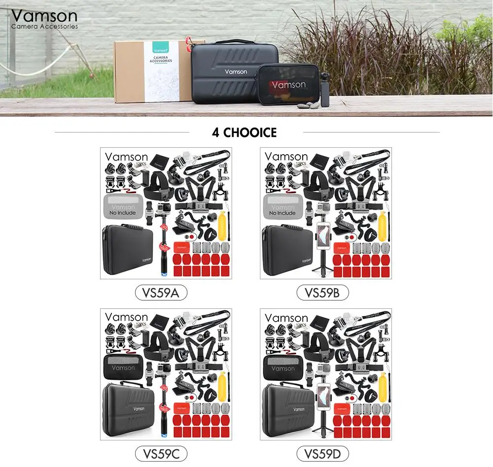 Часто задаваемые вопросы: для каких экшн-камер подходят? A: совместимость для gopro hero 7 6 5 4 3 2 1/для Xiaomi yi 1/yi 2/yi 4 k/yi 4 k +/yi lite/для SJCAM SJ4000 sj5000 SJ6000 sj7000/для DJI OSMO Action camera/ для eken/SOOCOO/SONY и большинства экшн-камер Q: включает ли он камеру? A: не включает камеру/пульт дистанционного управления/водонепроницаемый корпус чехол несколько вариантов доступны, что входит в комплект VS59A/VS59B ----- старая сумка для переноски VS59C/VS59D ----- новая сумка для переноски